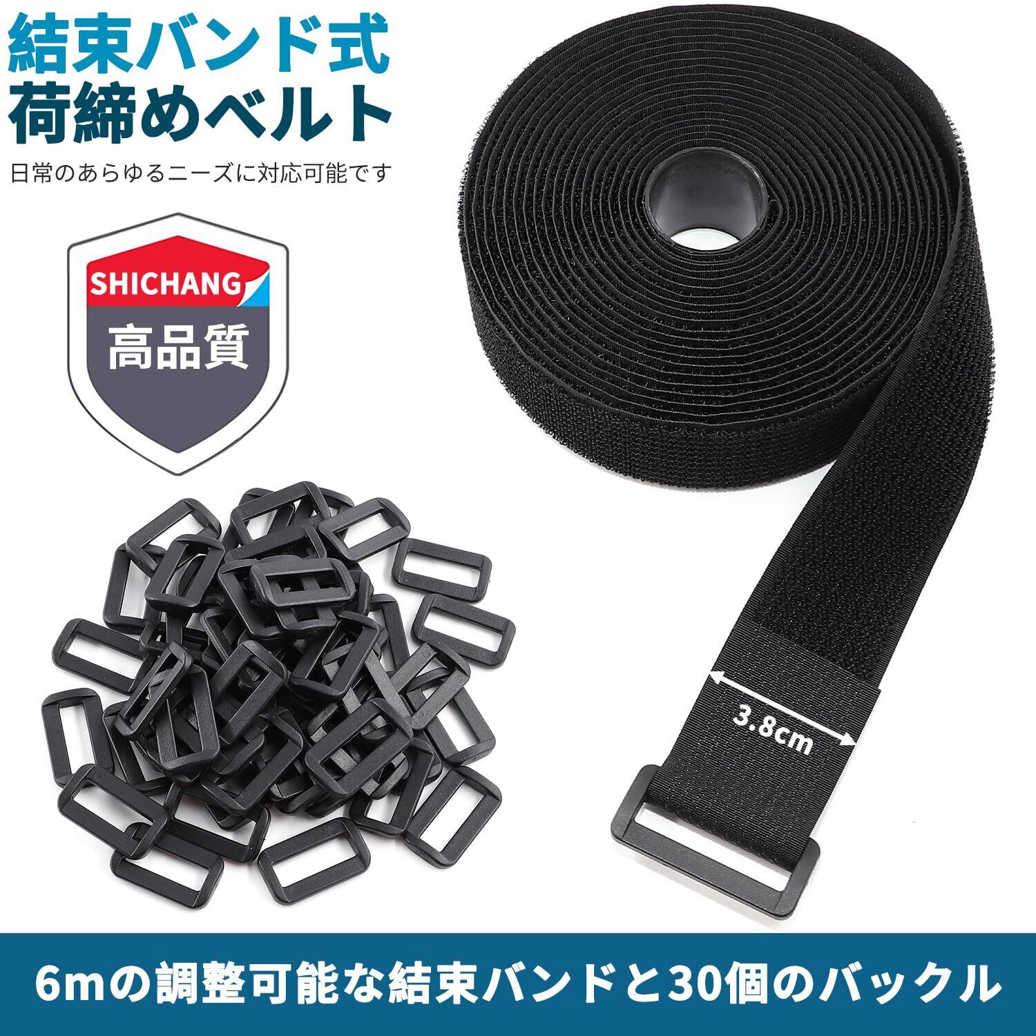 【数量限定】マジック結束バンド 6m 幅3.8cm+バックル 30個付き、結束テープ 荷締めベルト 固定ベルト 結束マジック 面ファスナー テープ 強力 耐熱 配線整理 自由にカット 繰り返し 荷物梱包 収納用テープ(黒色)