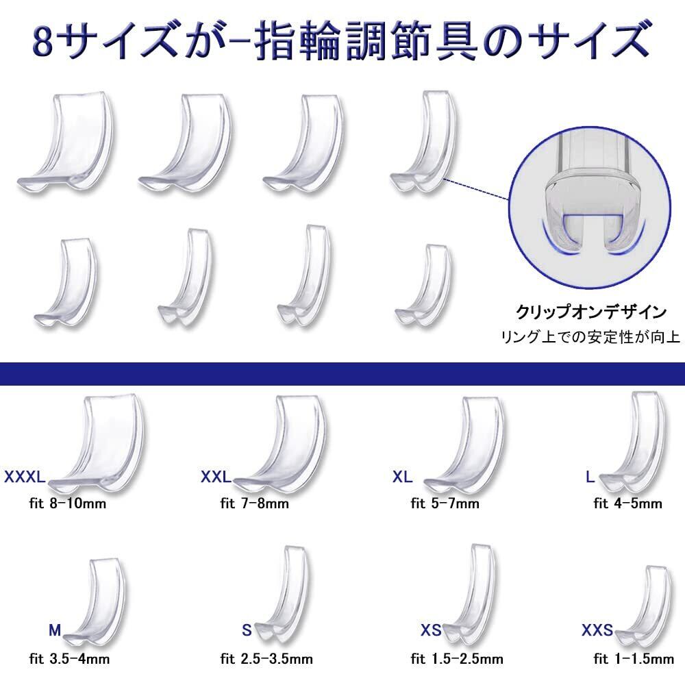 【セット内容】8サイズが。指輪調節具のサイズ:1.5mmXXS*1、2.5mmXS*1、3.5mmS*1、4mmM*1、5mmL*1、7mmXL*1、8mmXXL*1、10mmXXXL*1。幅は1mm~10mmの指輪に対応
