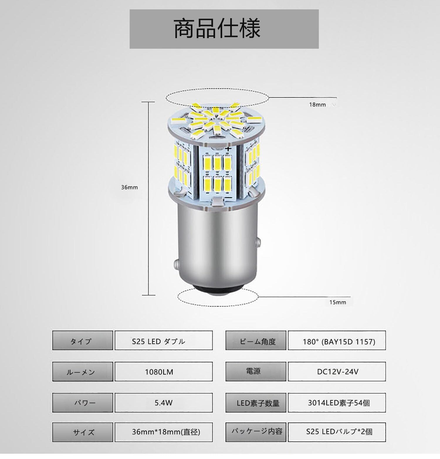 【商品仕様】S25_180°(ダブル)、【光色】6500k(白・ホワイト)、【対応電圧】DC12V/24V、【LED】3014SMD、【商品内容】LEDバルブ 2球