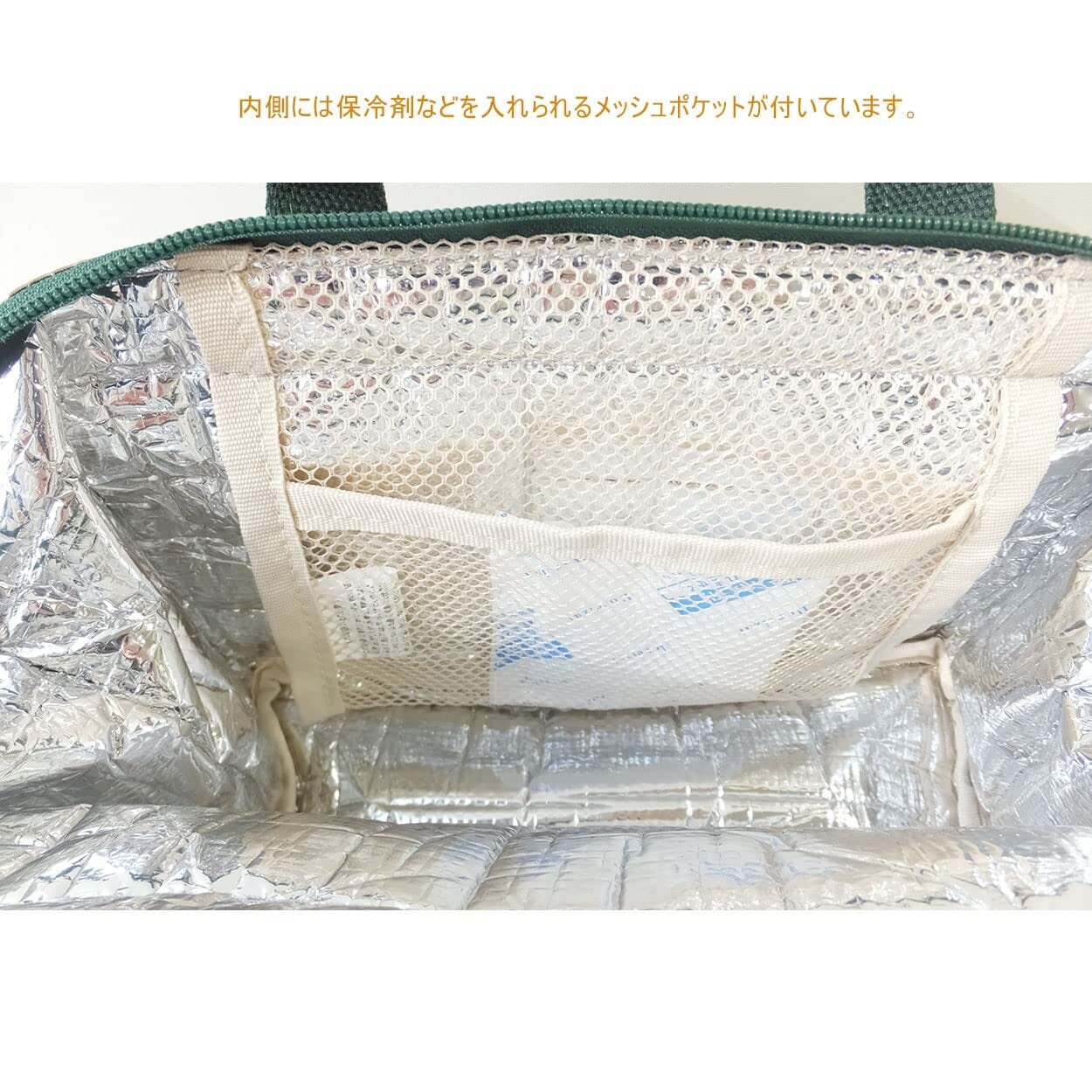 【内側はアルミフィルム】内側の素材はアルミフィルムで保冷保温使用。保冷剤などを入れるのにぴったりのメッシュポケットが付いています。
