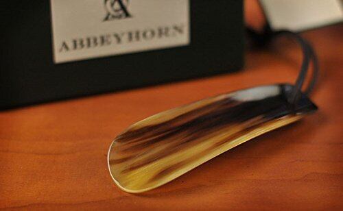 250年以上の歴史を誇る英国の老舗「アビーホーン」abbeyhorn製、天然の水牛の角を削りだしたタッセル付きのシューホーンです。 プラスチックより硬質で、かつ滑りが良いので靴を楽に履くことができます。 何より、上質な素材を手にすることにより、毎日の「靴を履く」という行為に、ほんの少しの彩りがプラスされることでしょう。1点1点天然の素材からできているためそれぞれ違った表情を楽しむことができます。湖水地方のすぐ近くカーンフォースという町に、牛や牡鹿の角の彫刻品メーカーとして設立。伝統的シューホーンブランドのパイオニアで、現存する世界最古の靴べら専門メーカーである。中でも水牛の角から削り出される一本物のハンドシューホーンやロングホーンには、世界中にファンを抱えるだけでなく、世界中の最高級シューズショップでも使用される由緒正しい靴ベラとして有名である。英語で「Shoehorn(靴べら)」という言葉が『靴・角』という単語からできていることからも分かるように、靴べらの素材の元祖は角。アビホーンの靴べらは、セルロイドやプラスチックなど、産業革命から技術革新の大量生産時代まで、あらゆる時代の波から職人気質の英国人が守り抜いた逸品。 味のある紋様などは、当然のごとく一本ずつ異なるのが特徴で、世界でただ一つの靴ベラを所有する喜びを得られる。実用面では、手に持った時の収まりが大変良いだけでなく、表面の滑らかな加工により心地よい馴染み感を得られるのも魅力。 また、角それぞれの個性を生かした色で仕上げられており、その美しい光沢は角自体のきめの細かさからくる自然のつやである。