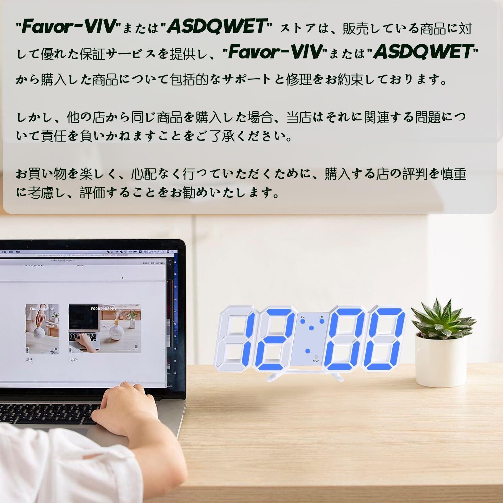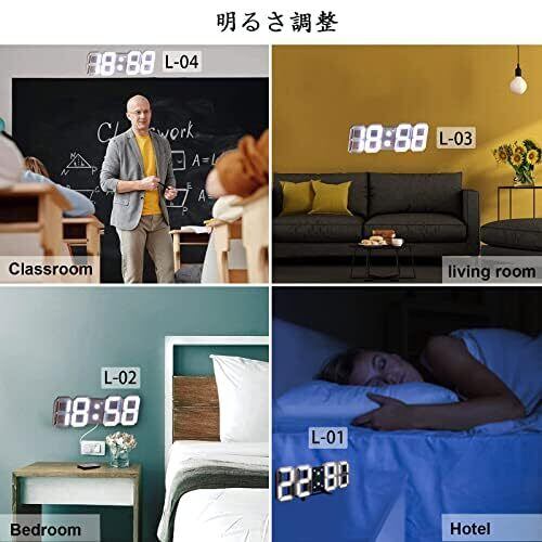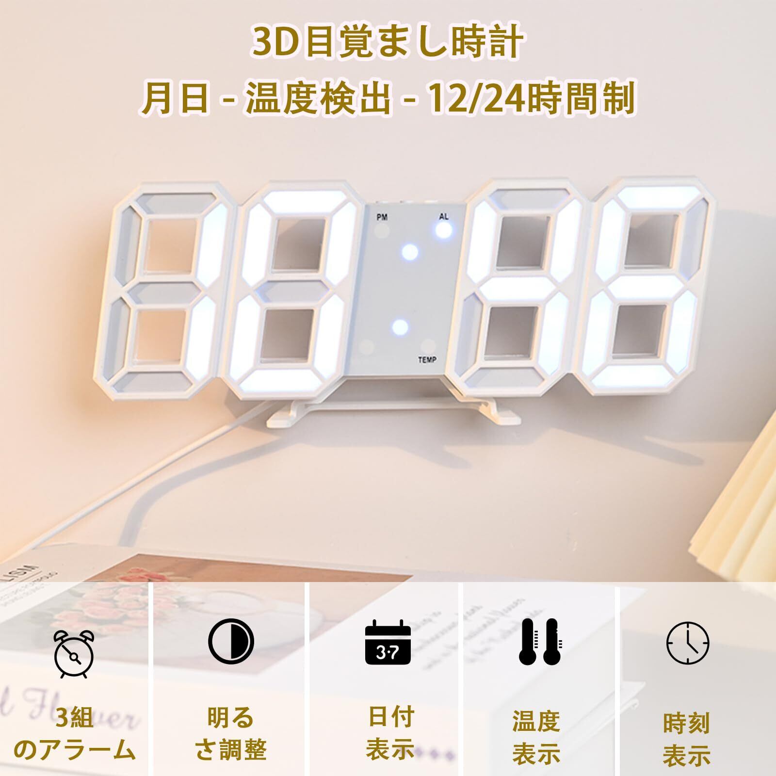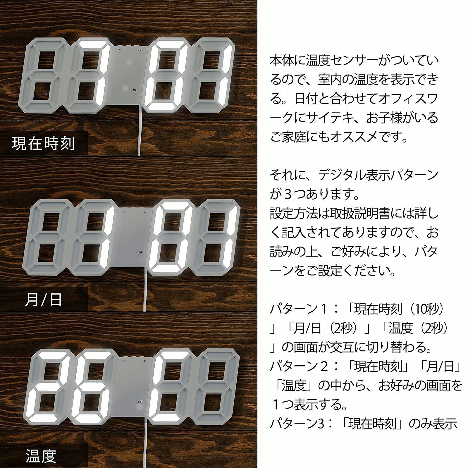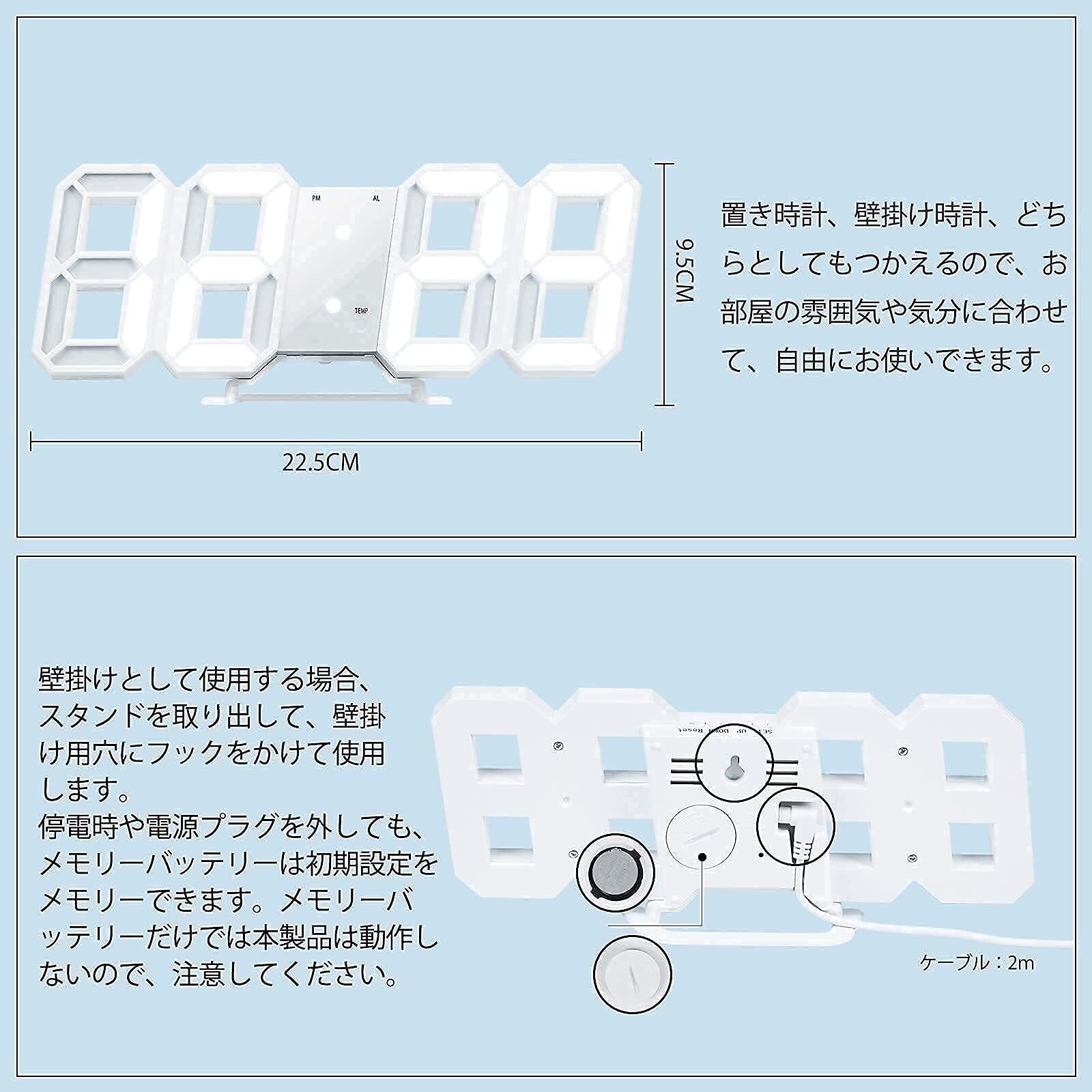 LEDデジタル時計 目覚まし 3D wall clock 置き時計 壁掛け スヌーズ アラーム 明るさ調整 ナイトランプ 年/月/日温度表示 キッチン 日本語取扱説明書付き 2022 アップグレード版 -- オーセンティックストア:FAVOR-VIV (白い, 青色光)