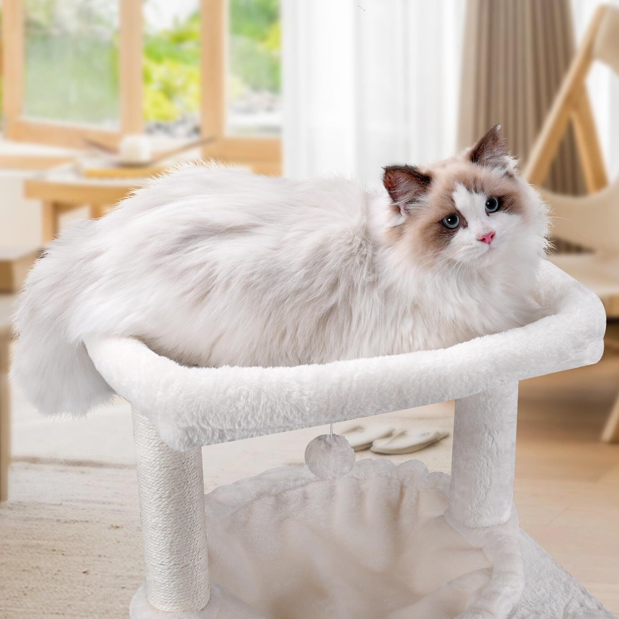 ハンモック·ボンボンおもちゃ·爪とぎ板·二つの猫ハウス、支柱の表面は麻縄巻き(サイザル麻100%)、高台には充填物があり、猫用ベッドにもなります。 猫ちゃんの好みに合わせて多彩な要素を用意しています。