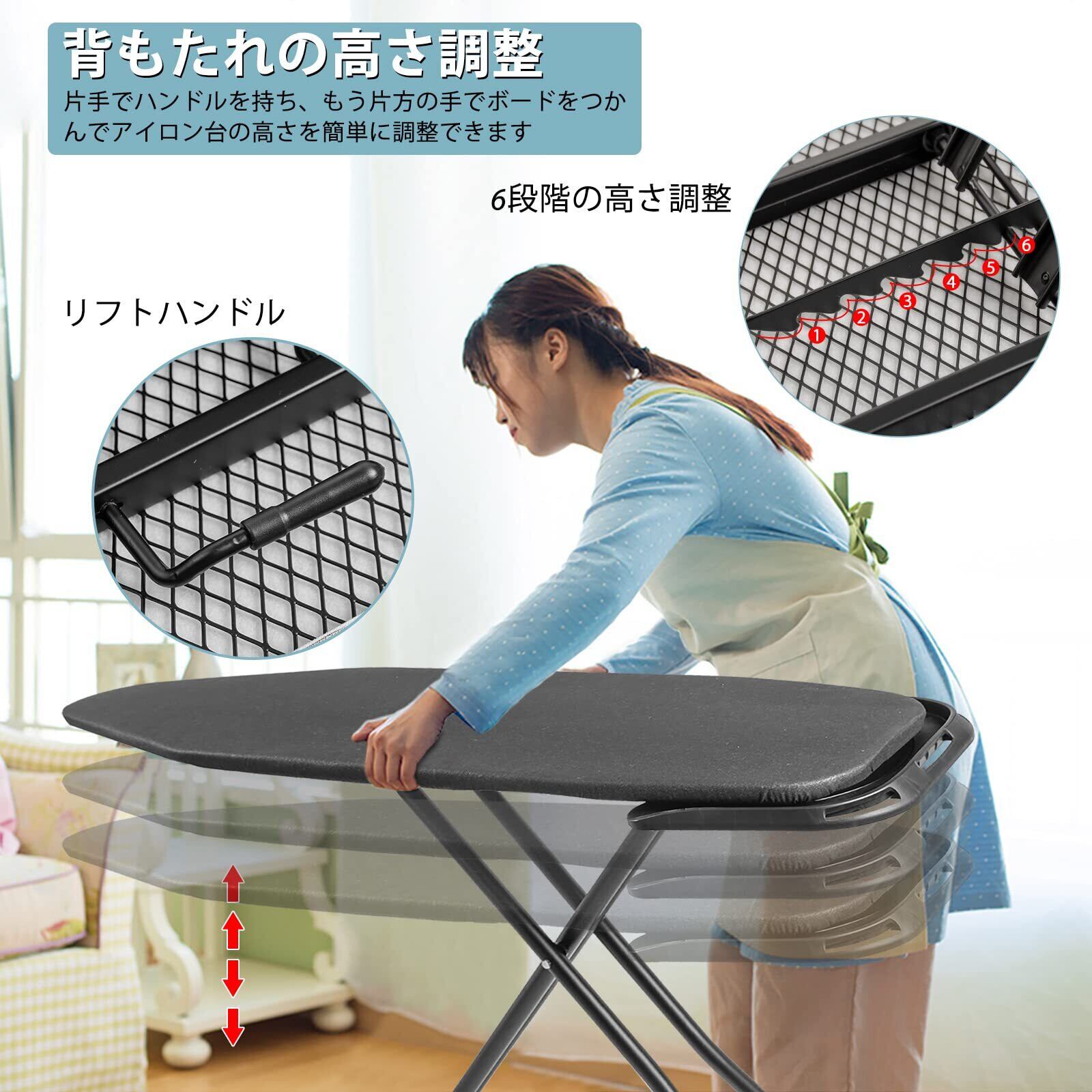 【6段調節可能】高さ調節最高87cm、最低69cm、立っても座ってもアイロン掛けられます。