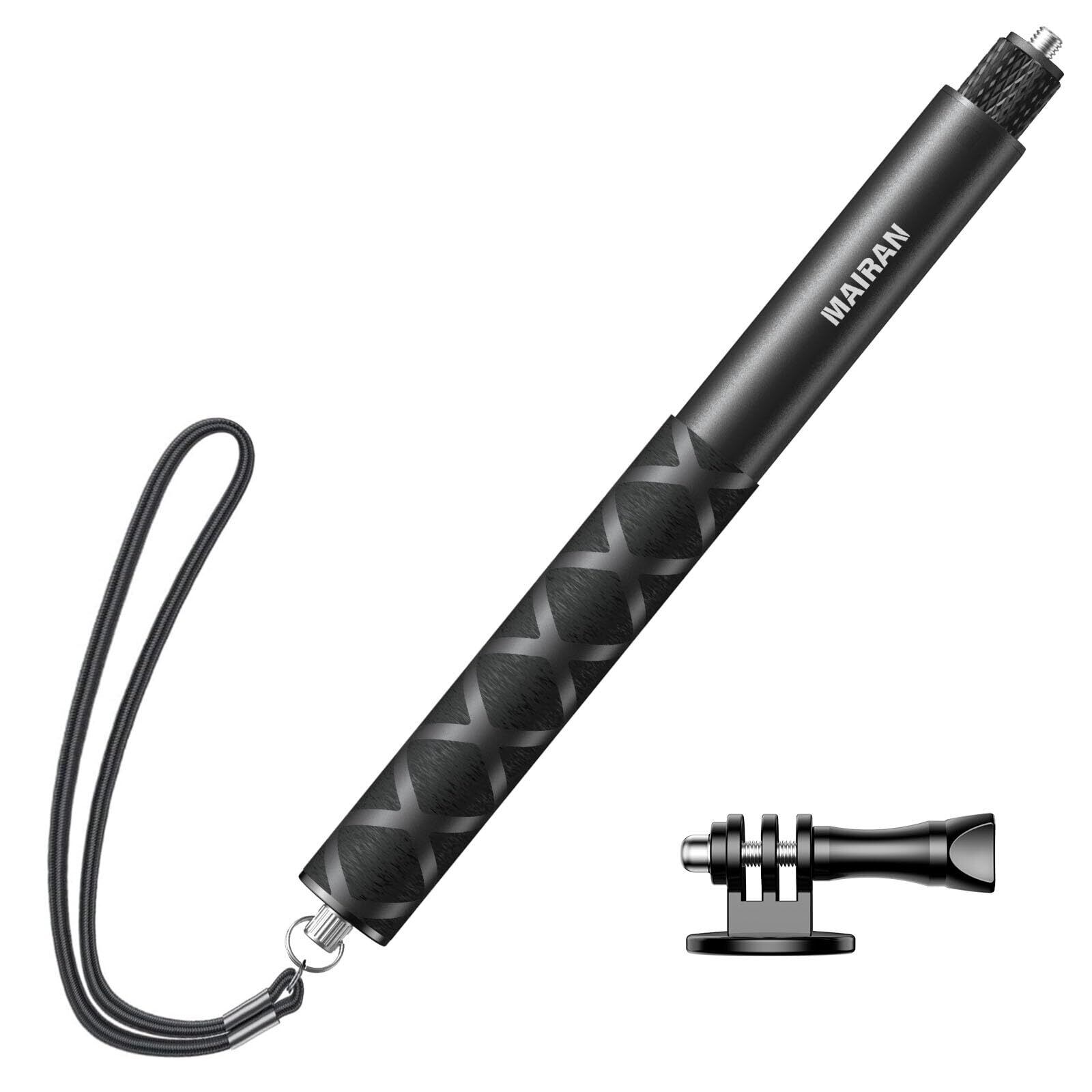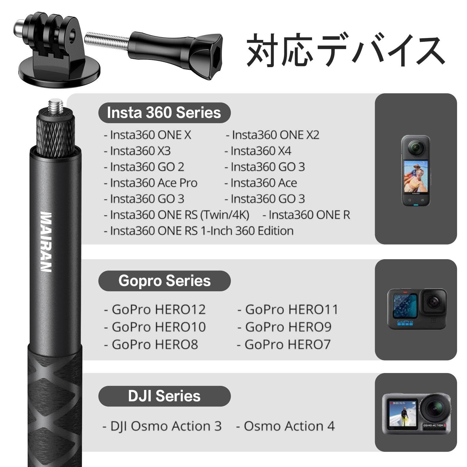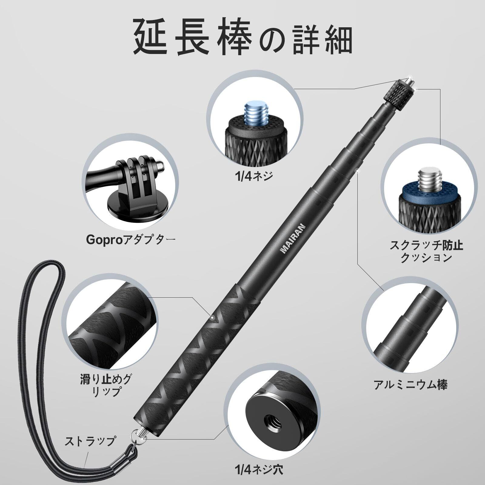 Mairan Insta360用114cm 見えない自撮り棒 GoPro用マウントつき DJIアクションカメラ用自撮り棒 1/4インチネジ 7階伸縮 軽量 携帯便利 アルミ製 GoPro hero12用/11/10/9/Insta360X4用/X3/DJI Osmo Actionに対応 セルフィー/撮影録画/動画鑑賞配信に最適