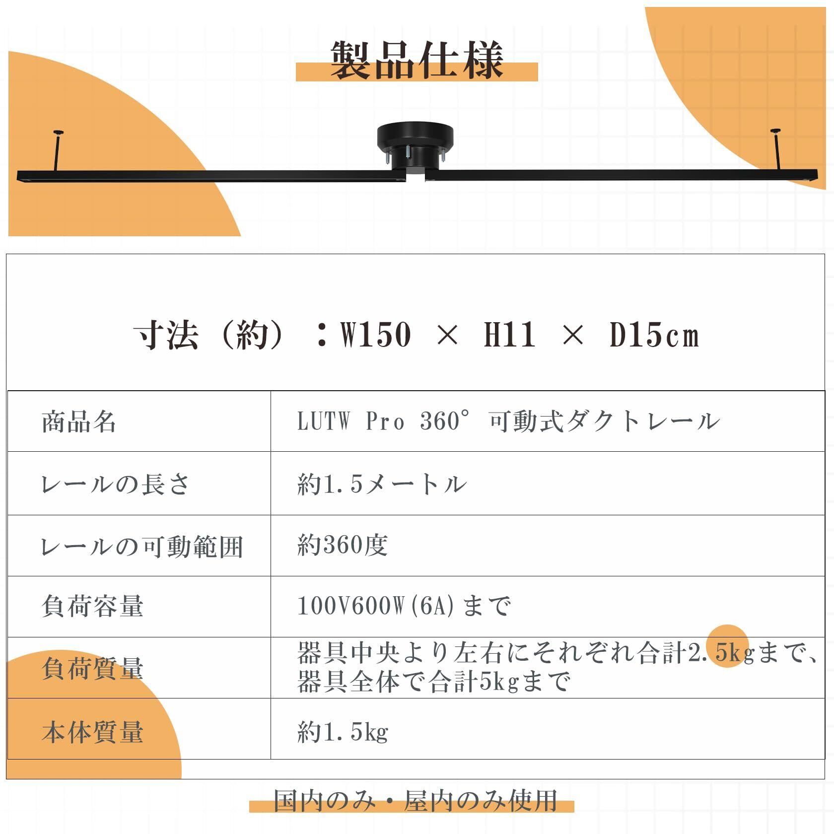 【製品仕様】商品名:LUTW Pro 360°可動式ダクトレール 幅(展開サイズ):約1.5m 素材:鉄 負荷容量:100V600W(6A)まで 負荷質量:最大5kg(片側最大2.5kg) 可動範囲:360度 保証期間:1年