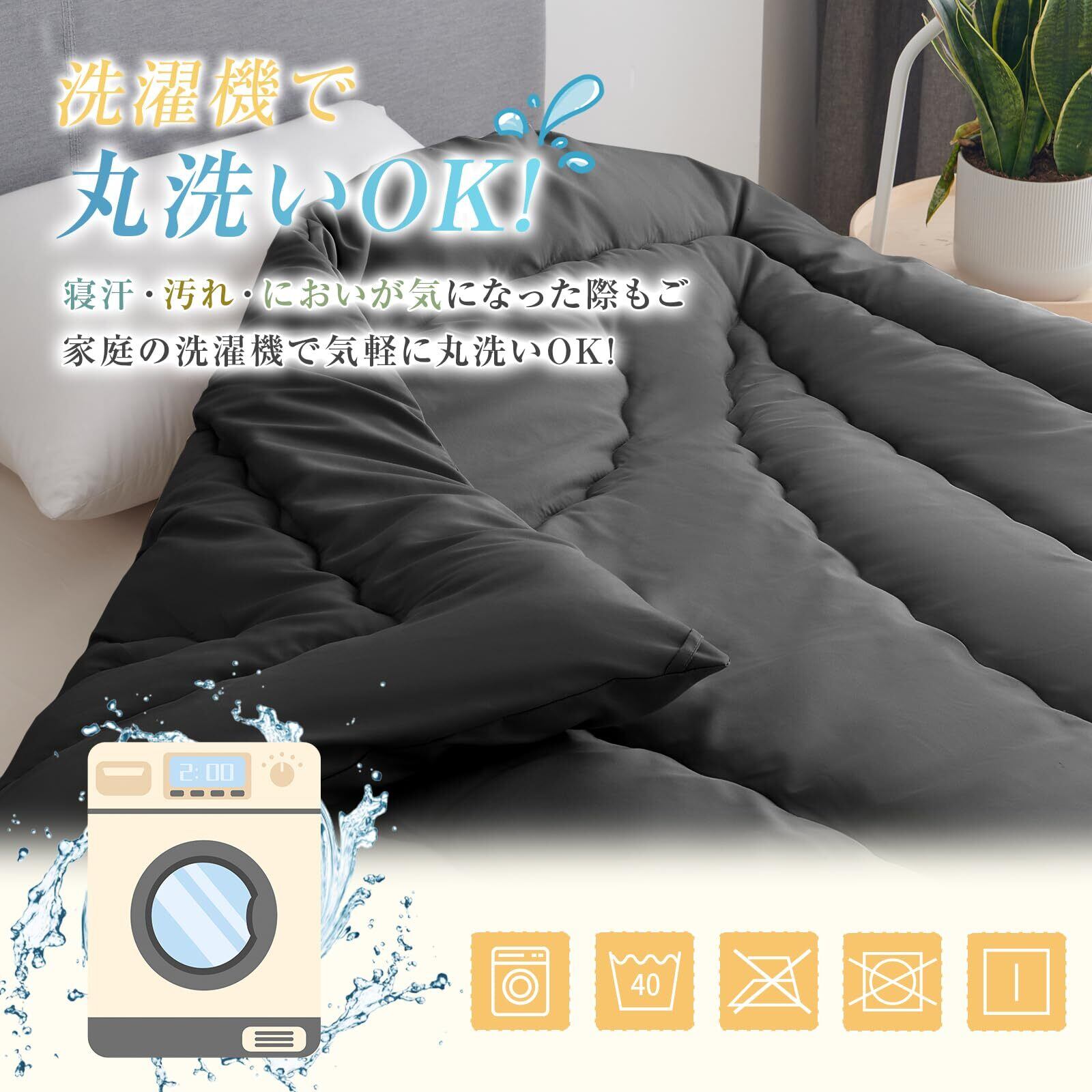 ①商品サイズ:幅約150cm×奥行約210cm(シングルサイズ)②商品重量:約1.5kg③材質/表地:ポリエステル100% (ピーチスキン加工)、詰め物(重量:1.0kg)、上層部:ポリエステル100%、下層部:ポリエステル100%④カバー取り付け紐数:8カ所 ⑤お手入れ方法:洗濯機で簡単に洗えるため、手間いらずで清潔を保つことができます。特別な手入れが不要で、日常的な使用に最適です。