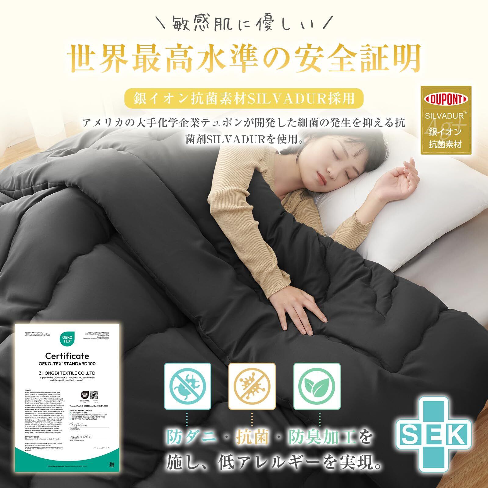 【銀イオン抗菌素材SILVADUR採用、SEKマークを取得】認証マークで高品質、アメリカの大手化学企業デュポンが開発した細菌の発生を抑える抗菌剤SILVADURを使用します。 確かな技術でいつまでも生地を清潔に保ちます。掛けふとんの側地に抗菌・防臭・防カビ加工を施しています。SEK認証された優れた抗菌防臭効果で、細菌の増殖を抑え、防臭効果を発揮します。