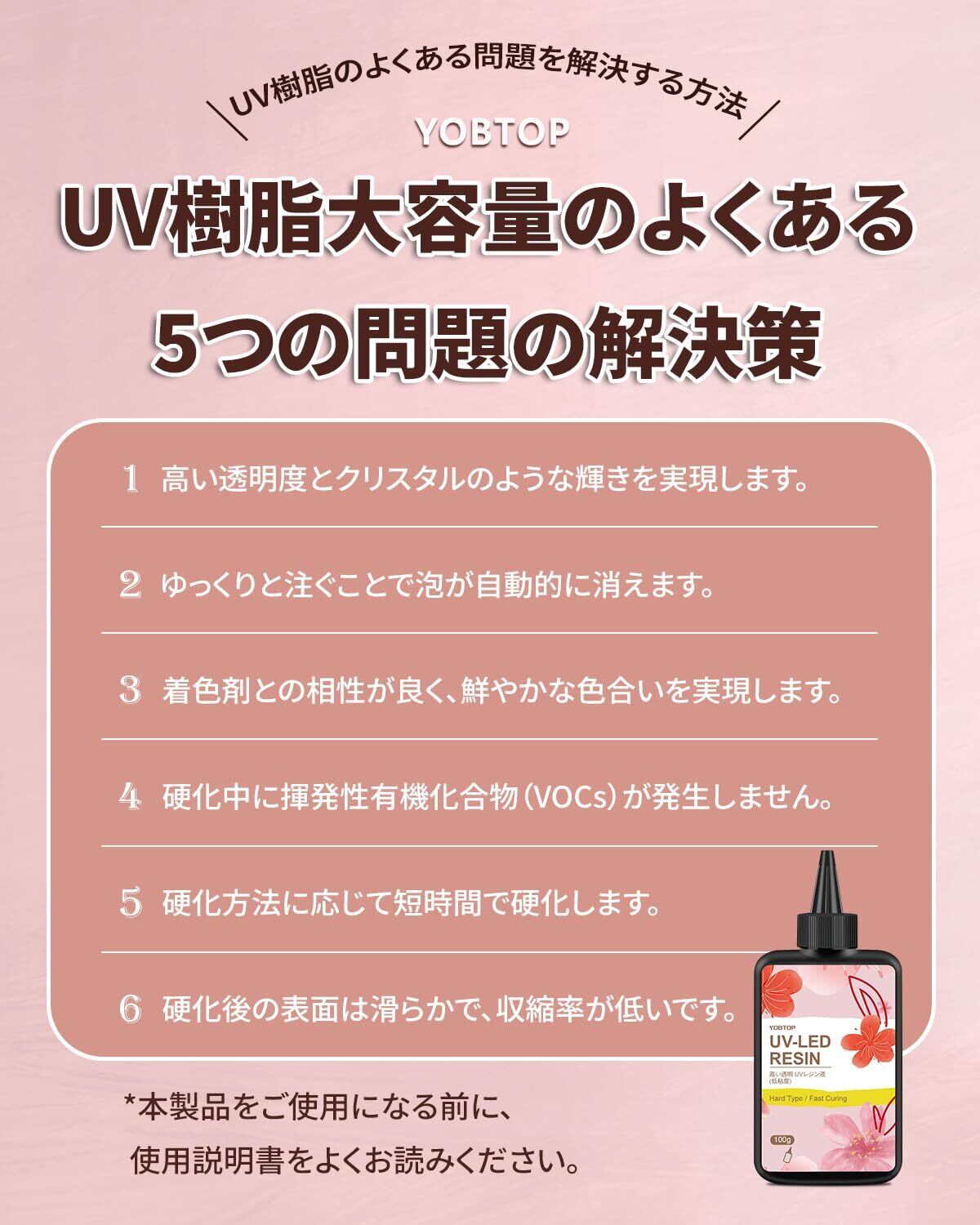 【高品質の製品】YOBTOPは長年の樹脂生産の経験を持っており、レジンは環境に優しい材料で作られており、安定した性能を提供します、レジン液は非毒性、非VOCです。購入した製品に何か問題がある場合は、当社の顧客サポートに連絡してください、私たちはあなたに満足のいく答えを与えるでしょう。