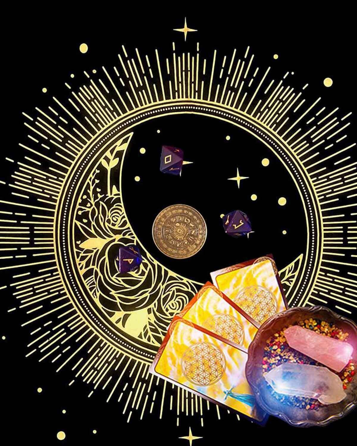 【多機能】カード占いすべてに重宝する占いの手品です。テーブルに敷くだけで、異次元空間へと導いてくれるタロットクロス。集中力を高め、豊かな想像力を発揮させてくれます。また、タロットカードに傷や汚れがつくことを防止したり、太陽 月 星座のデザインをあしらいました。 神秘的で美しく、テーブルクロスやタペストリーとしても使えます。