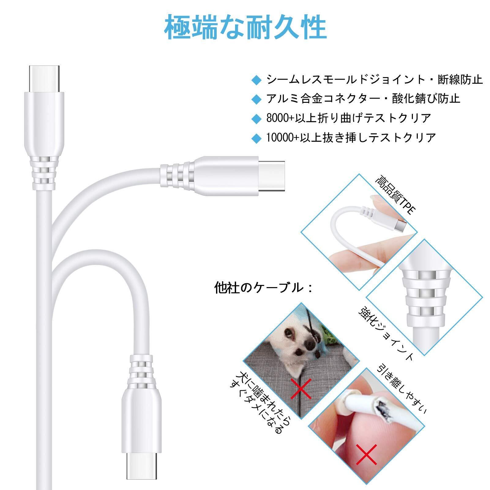 【高耐久Type C USBケーブル】外部には厳選された素材が優れたPVCによって作られて、柔軟性がよく丈夫になります。10000回以上の折り曲げテストに合格しており、そのため劣化しにくく、内部には無酸素銅、アルミ箔などは耐磨耗性に優れて、長年にわたり御愛用頂けます。しかも、根元の部分にも耐久性を考慮するように、断線しにくい丈夫なつくりの充電コードです。充電ケーブルは180cmの長さで、車載、寝室、ソファ、バルコニーなどの各シーンに満足できます