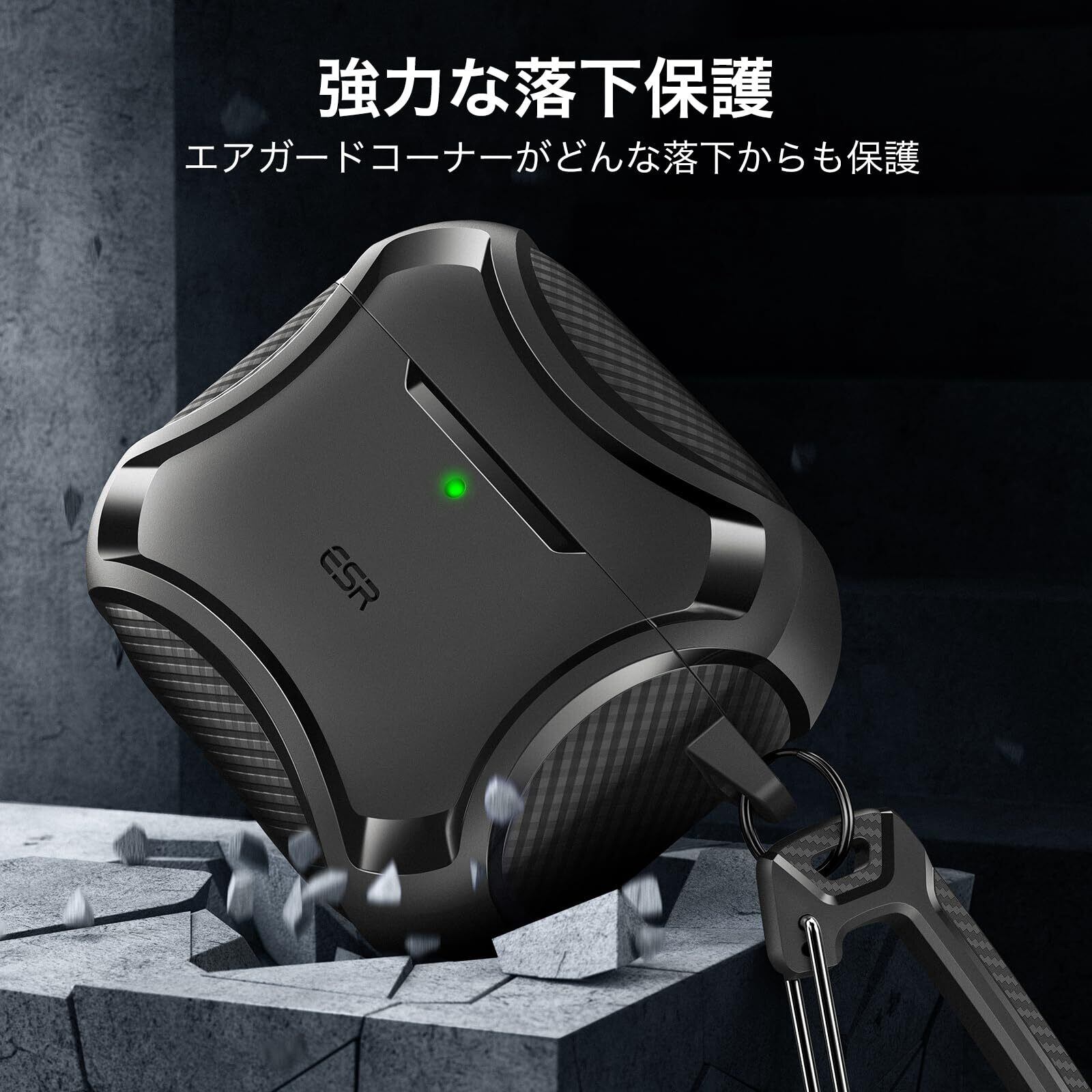 【強力な落下保護】:衝撃吸収ポリマーとエアガードコーナーが、最悪の落下や衝撃からも充電ケースを守ります。