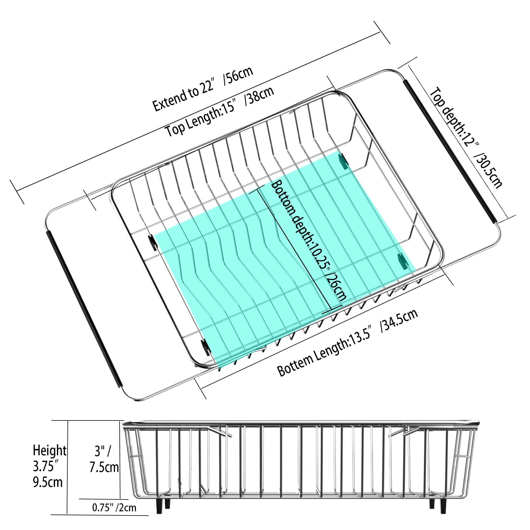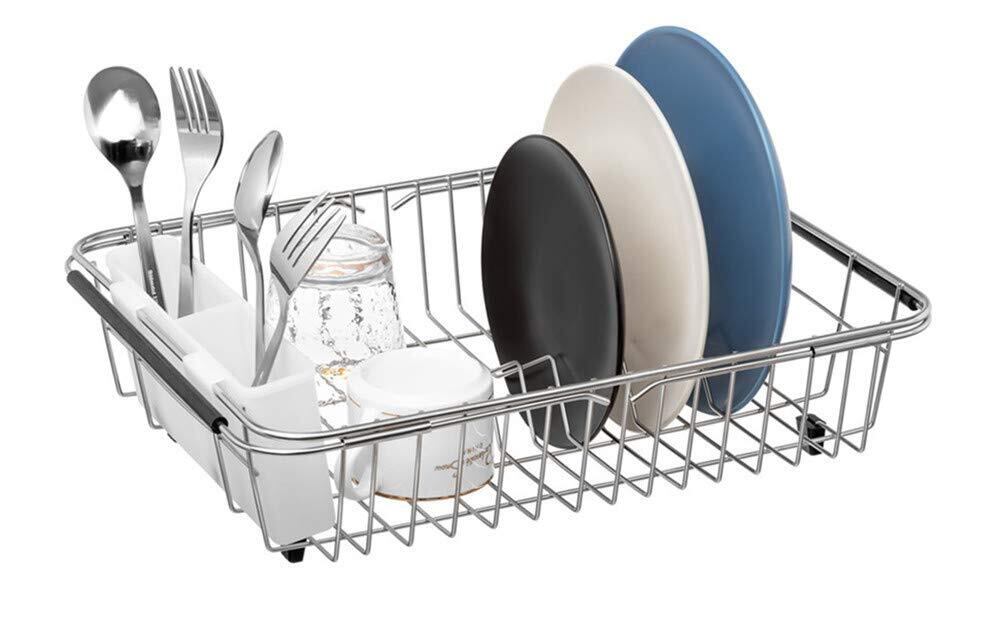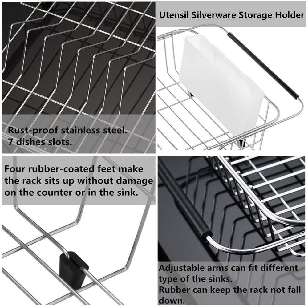 SANNO スライド式水切りかご 伸縮水切りワイヤーバスケット 食器水切りラック キッチンラック 皿置き 白いカトラリーホルダー付き ステンレス製