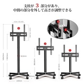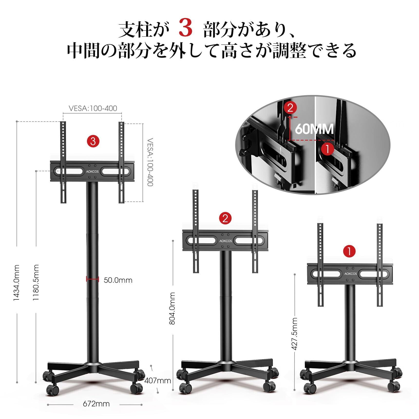【幅広い高さ調節】本体の高さは621~1434mm調整できます。支柱のパイプが3段あり、一段の長さは376.5mm、ブラケットは60mmごとに2段調整可能、テレビの取り付け高さは幅広い範囲内で6段階に自由に調整できます。