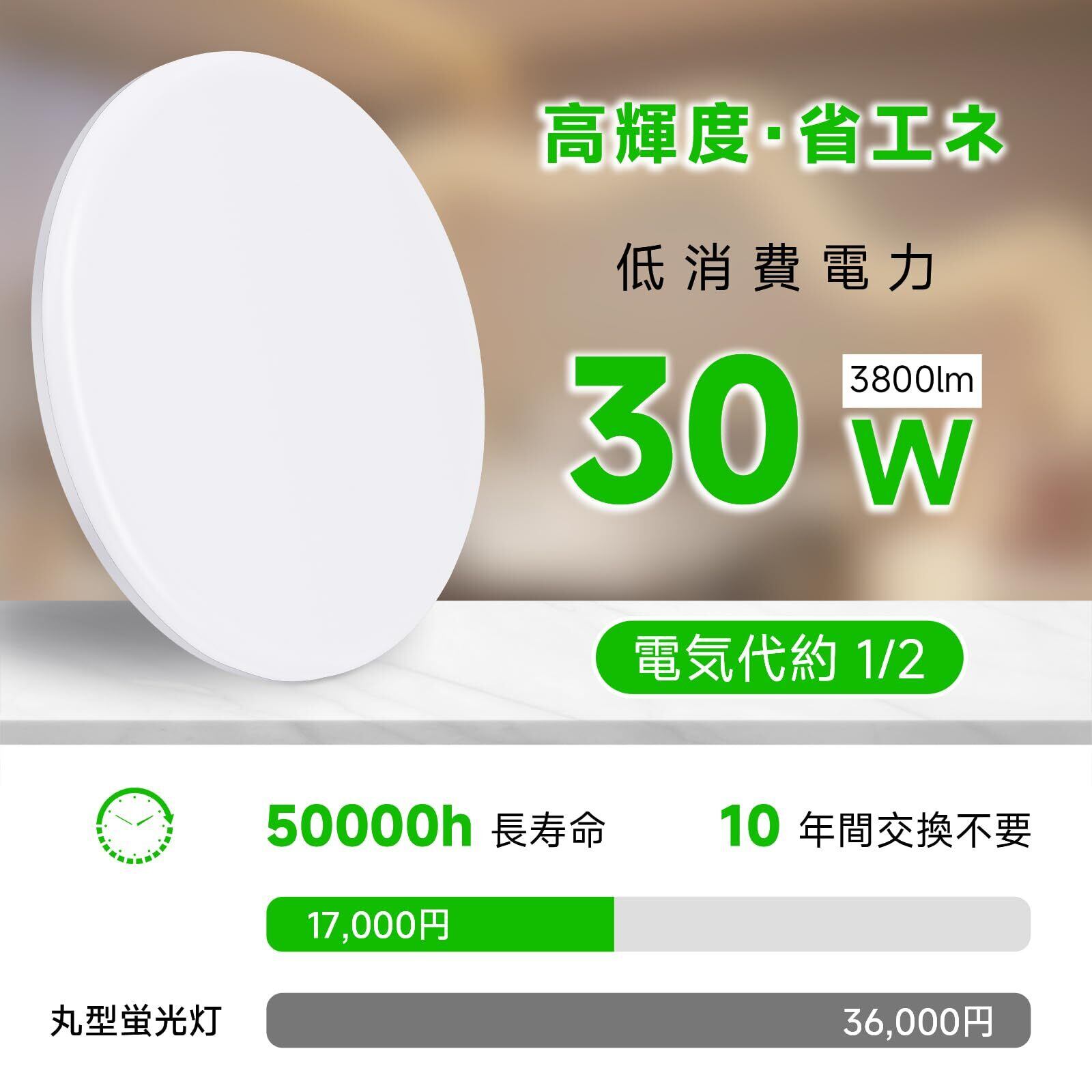 本製品はLED素子を採用しており、従来の電球よりも消費電力も少なく、発光効率も高いです(同じワット数の従来電球と比べると電気料金は半分、明るさは2倍)。無段階調光・調色可能、リモコンでライトの明るさと色温度の設定ができます。ワット数28W、明るさ4200lm、直径30cm、厚さ2.5cm。
