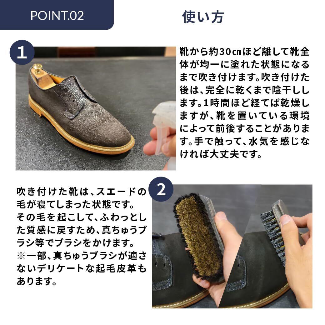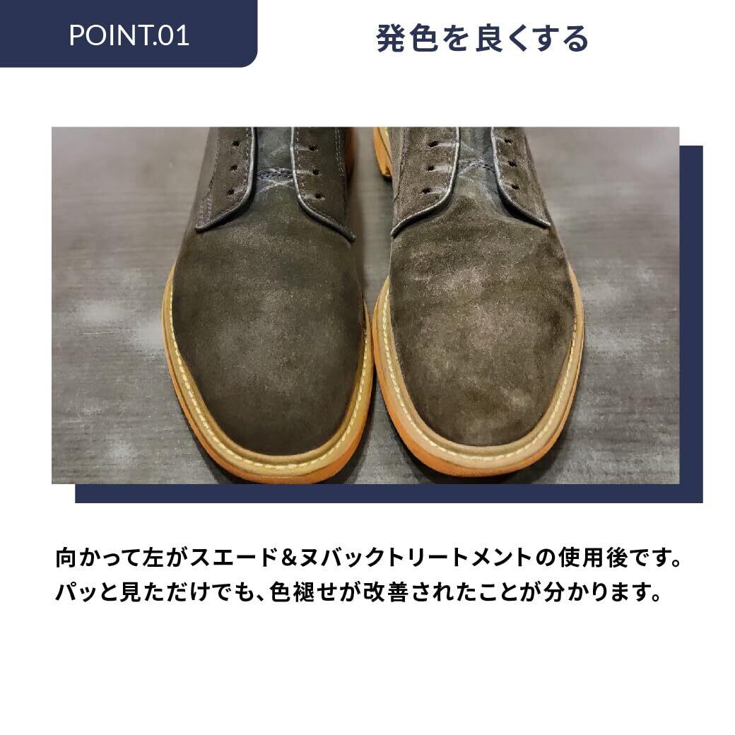 ・乾燥してしまったスエード・ヌバックに十分な潤いと栄養を与えます。・乾燥や経年により退色してしまった革が潤うことで発色が良くなり、もともとの色が蘇ります! ・ミストタイプなので革に浸透しやすく深くまで浸透し乾く過程で革の深部の色を表面に押し上げてくれます。・ブラッシングでホコリを落とし、毛並みを整えた後でご使用下さい。・乾いたら再度ブラッシングをすることで発色の良さを実感できます。・何度か繰り返すことで発色が蘇ります。※この製品自体には防水効果はありませんので、ケアの仕上げに【M.モゥブレィ スエードカラーフレッシュ】を使用し、防水力と与えてください。※この商品で色が戻りきらない場合は【FAMACO スエードカラーダイムリキッド】を使用し、補色し乾燥させた後で【M.モゥブレィ スエードヌバックトリートメント】→【M.モゥブレィ スエードカラーフレッシュ】の順に使用すれば確実です。