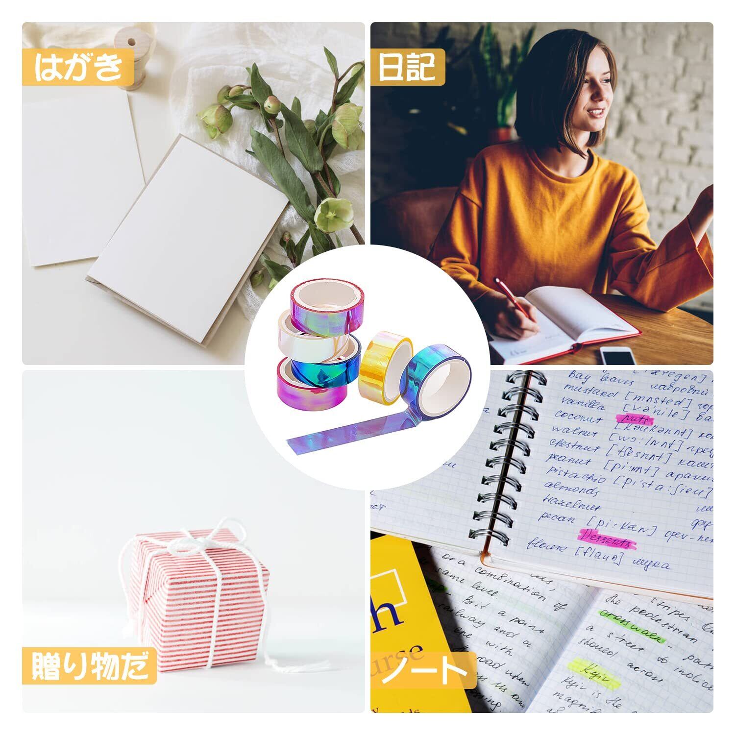 【製品の用途】DIYのピカピカの和紙テープ、かわいい和紙テープ、カレンダーページ、パッケージ、スクラップブックや消耗品、工芸品、日常の予定表にも適しています。