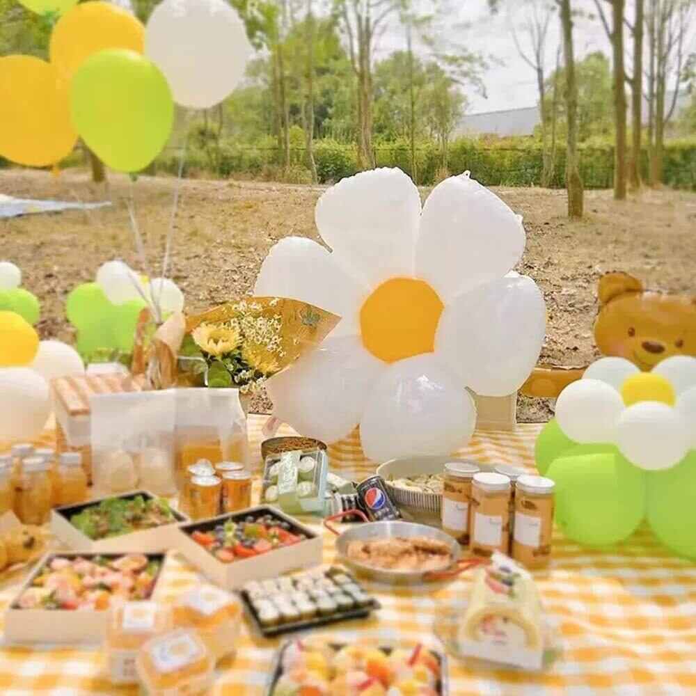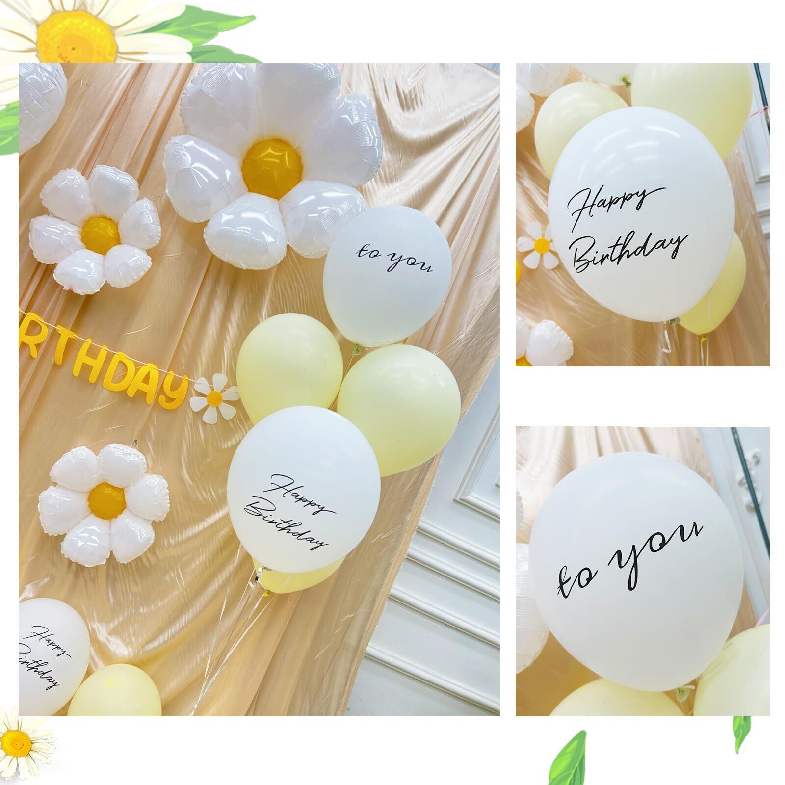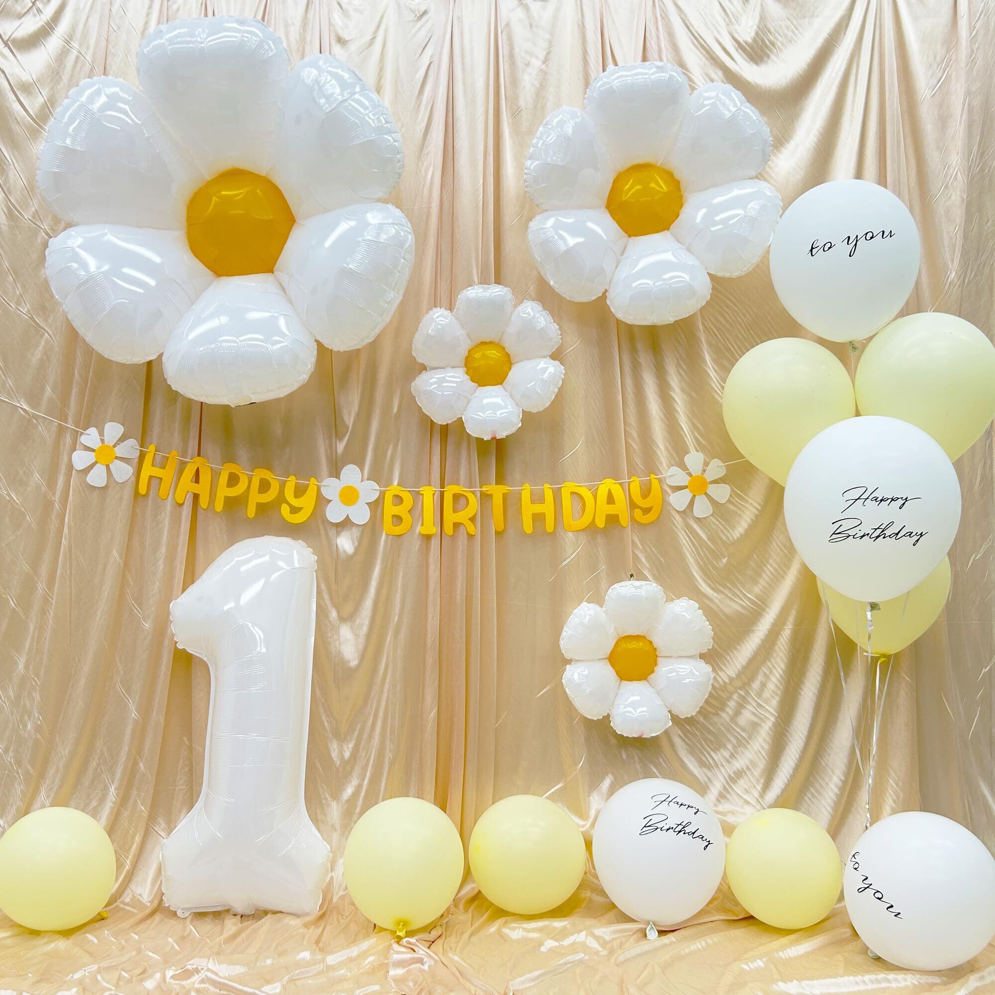 セット内容 - ゴム風船×8(HAPPY BIRTHDAY × 2、TO YOU × 2、うすい黄色× 4)、フェルト布ガーランド×1組、デイジーバルーン ×4、数字バルーン×1、リボンひも (10m)、両面テープ [ゴム風船専用]。