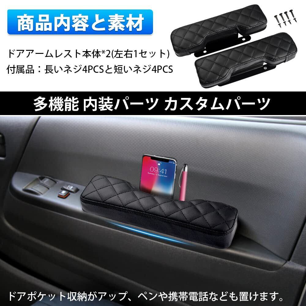 ②【商品内容と素材】ドアアームレスト本体*2(左右1セット)。付属品:長いネジ4PCSと短いネジ4PCS。高品質PUレザーと柔らかなタイプのスポンジ素材。独特なデザインと素材の合わせで、ユニックな快適感実現!取り扱いも便利に!上と下の面が菱形の縫製で、スタイリッシュを演出します。