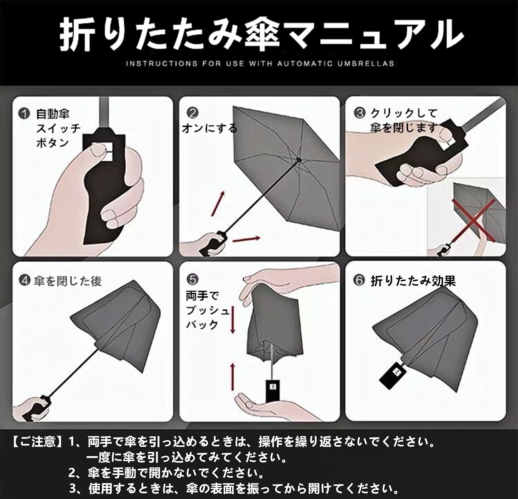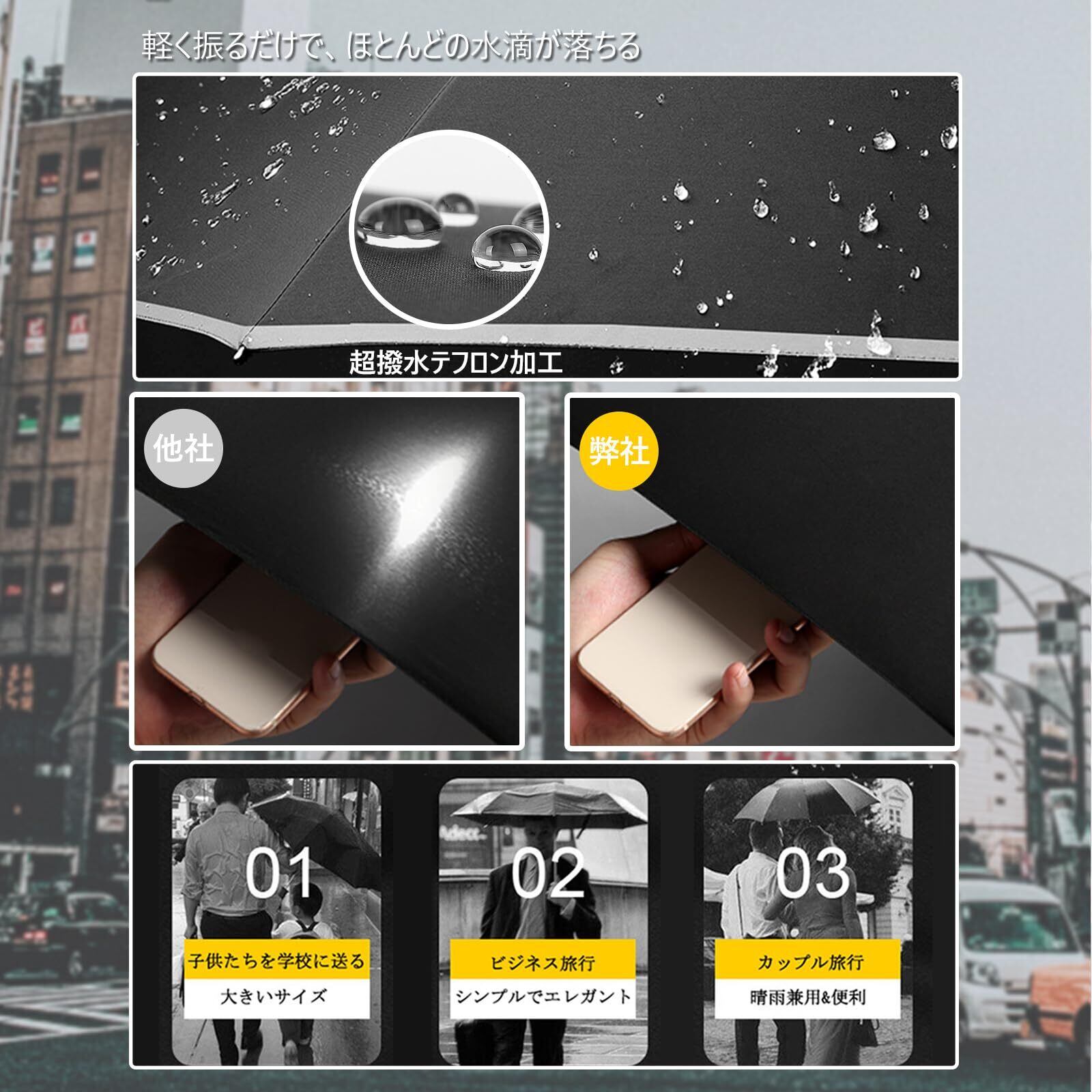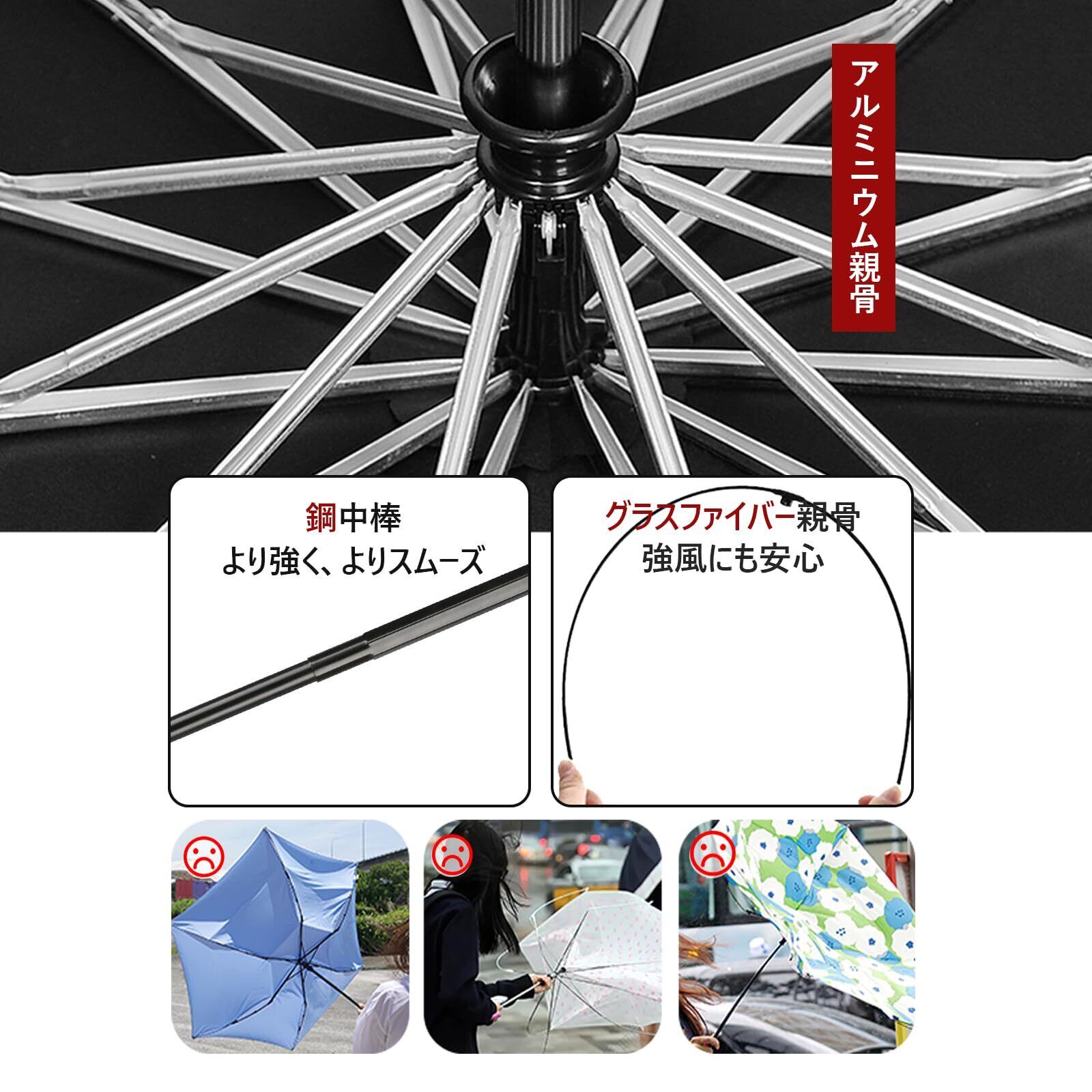 【丈夫な12本骨耐風折りたたみ傘】 アルミニウムとスチールを使用したシャフトで安定性を向上させており 強風で傘が裏返っても、固定接続部分に「遊び」があって元通りになるようになっています。グラスファイバーにより親骨の柔軟性と耐久性は通常の8本傘などに比べ強度が上がり、強風にも安心