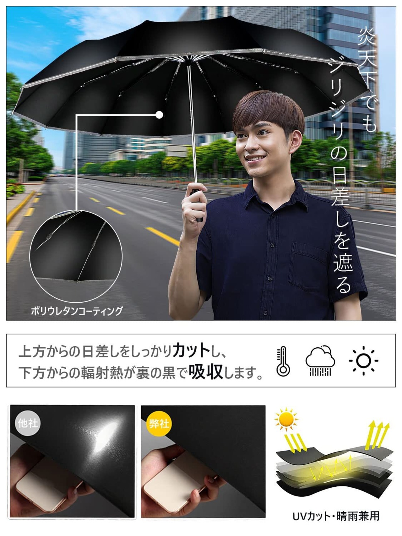 【UVカット・晴雨兼用】UVカット加工が施されている生地を採用したうえ、裏面がブラックコーティングされたおりたたみ傘で上方からの日差しをしっかりカットし、下方からの輻射熱が裏の黒で吸収して、炎天下でもジリジリの日差しを遮ってくれ、遮熱効果もあります。大切なお肌を太陽光線、紫外線からガードでき、日焼け対策アイテムとして猛暑を乗り切ります!