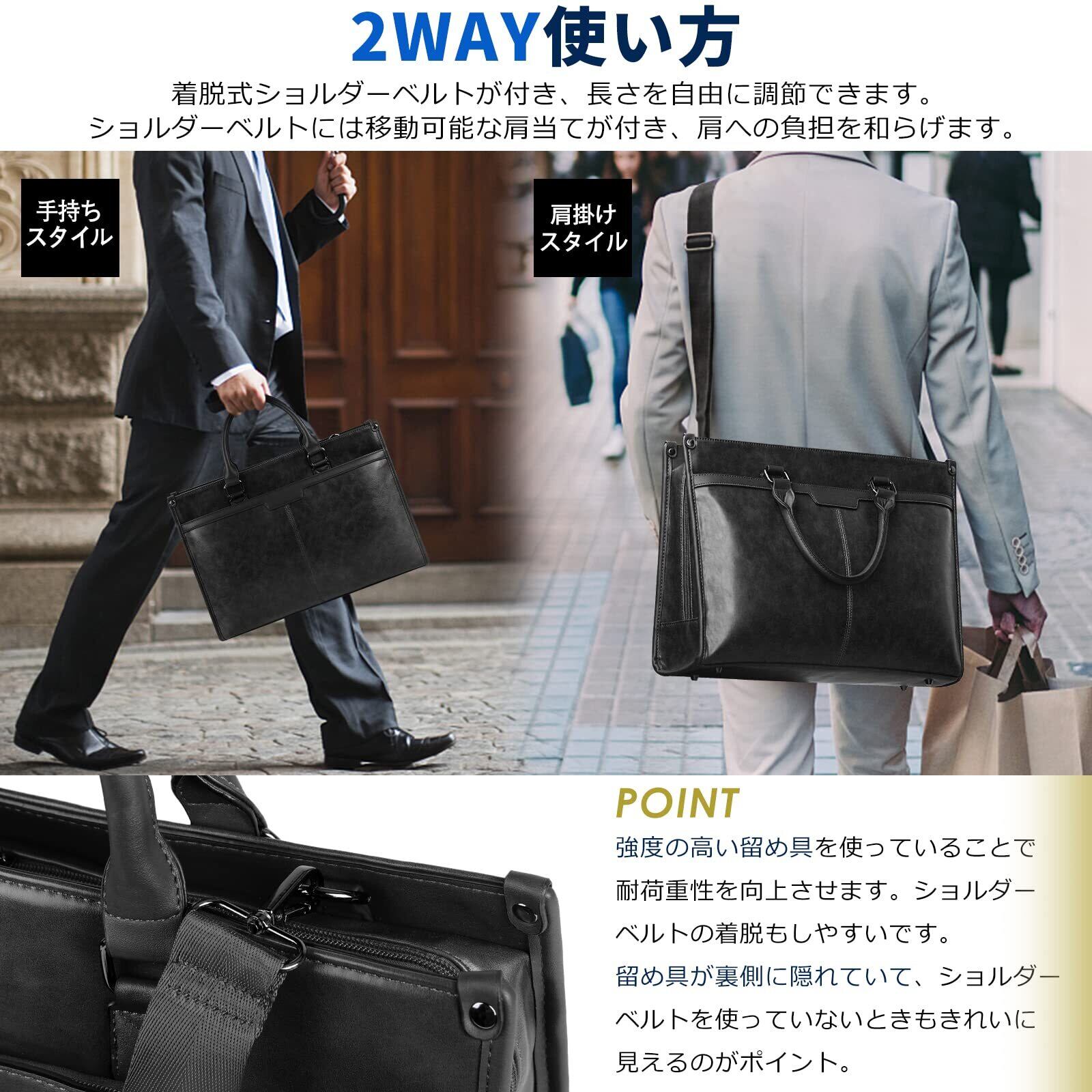 2WAY・実用的。ショルダーベルトがつき、自転車通勤や電車通勤の時に便利に持ち運べます。ベルトを取り出すと落ち着いた印象に見せるブリーフケースとなります、取引先に訪問する時の使用にふさわしいです。クッション付きのPCポケットを搭載するので、パソコンを持ち歩くのにピッタリです。水筒の漏れ防止の収納部があり、バッグが揺らんでも水筒が倒れにくいです