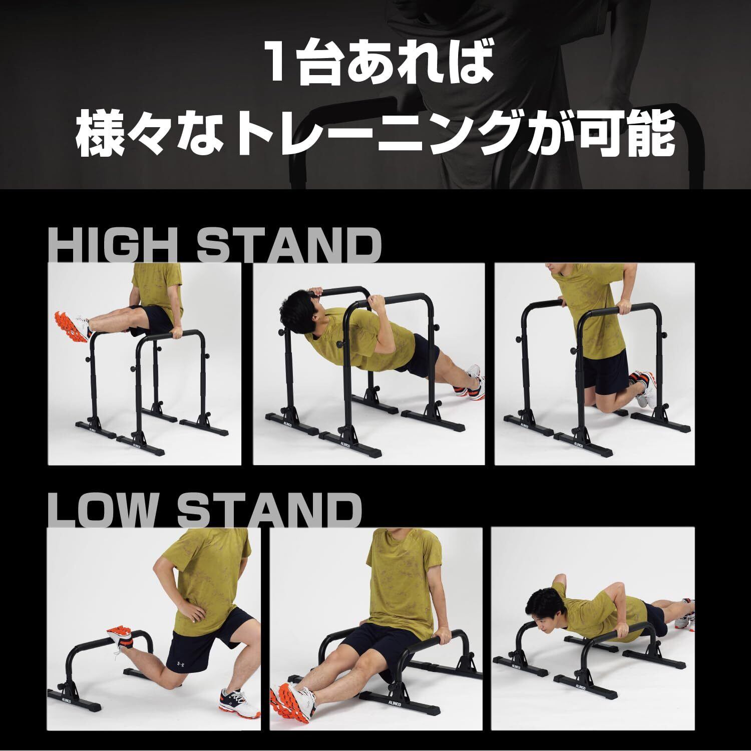 【握りやすいクッショングリップ、滑り止め付き】グリップ部はクッションで握りやすく快適に運動できます。グリップを握ることにより手首を90度に曲げずに済むので、手首の負担が軽減されます。また、ディップススタンドを使うことで、床で行う腕立て伏せよりも深く身体を降ろすことができるので、自宅でのトレーニング効果を高め、運動の幅を広げます。