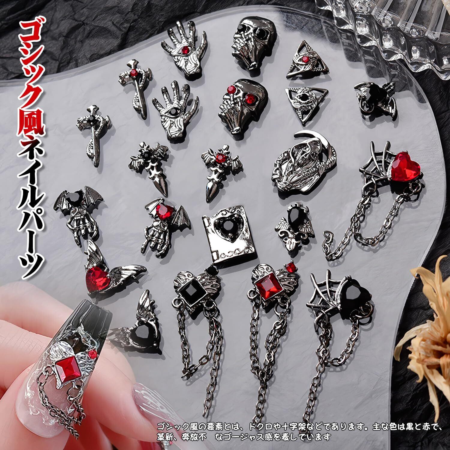 【多種類の大集合】セット内容:12種類で共に22個セットです。十字架、ドクロ、クモの巣、スカルハンド、死神、愛の翼など、パンクやゴシックのネイルパーツを一挙に満足させてくれます