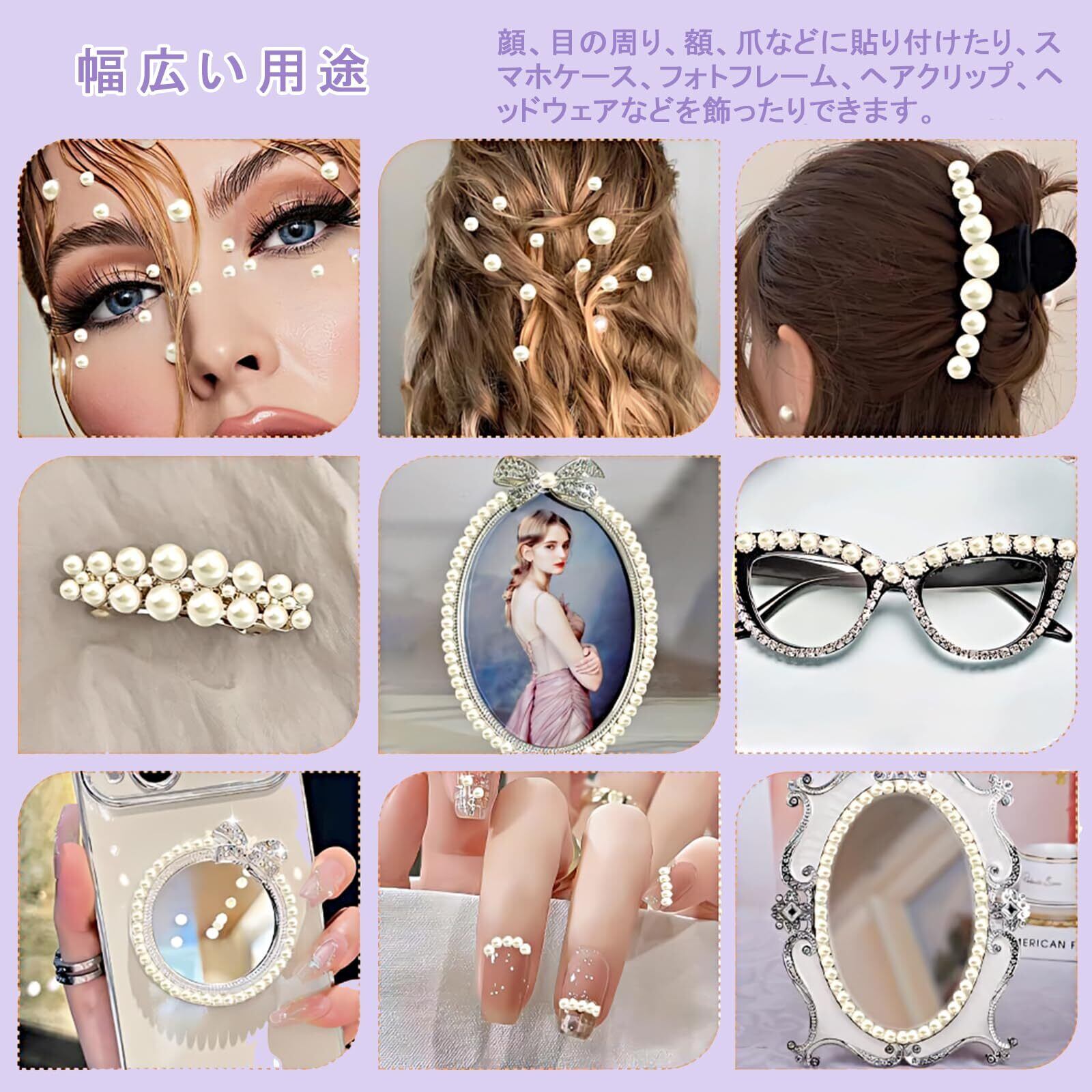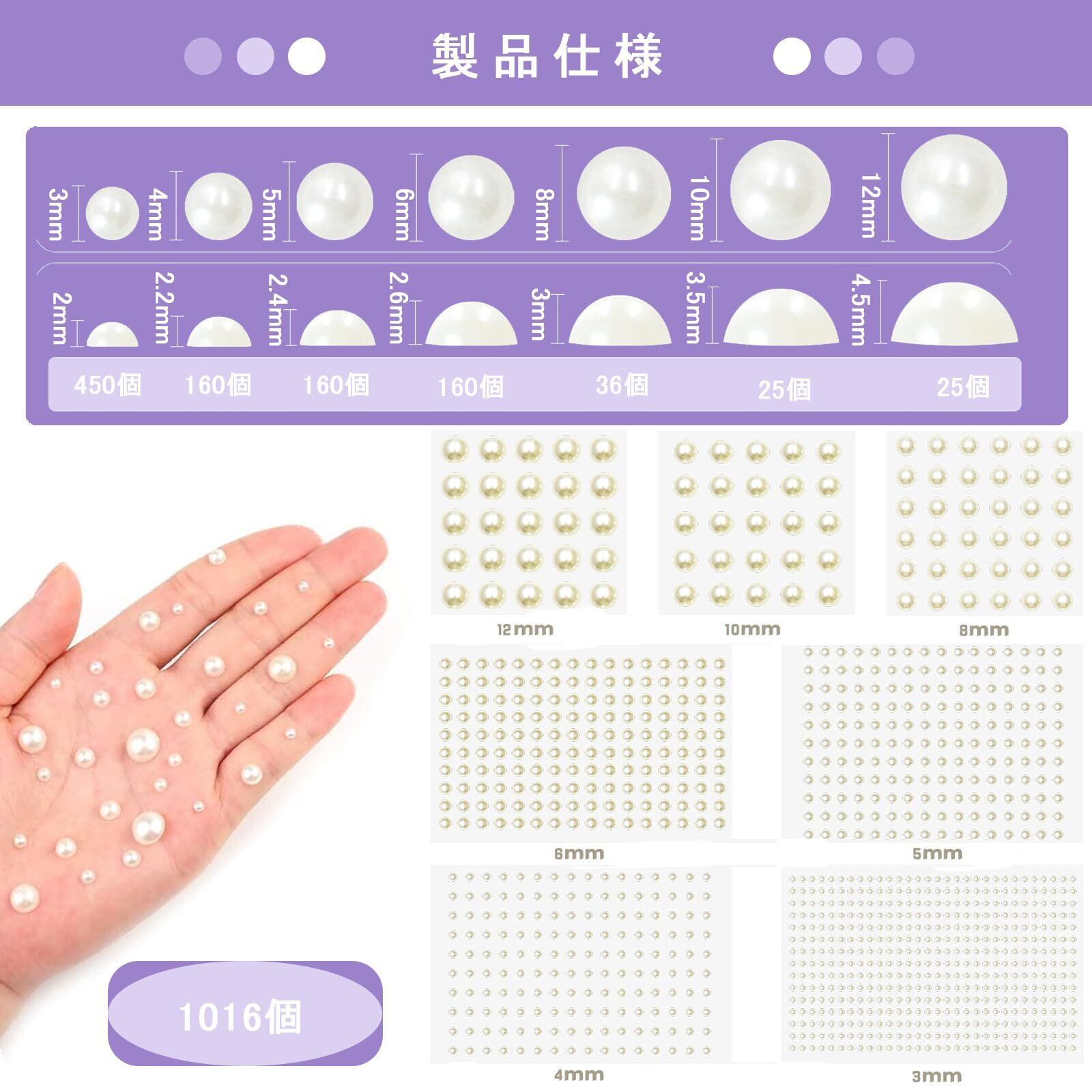 【商品仕様】7枚の異なるサイズのパールシールが含まれており、3mm 450個、4mm/5mm/6mmそれぞれ160個、8mm 36個、10mm 25個、12mm 25個。(注:小さな部品が含まれています、飲み込むことを避けるために子供から遠ざけてください。)