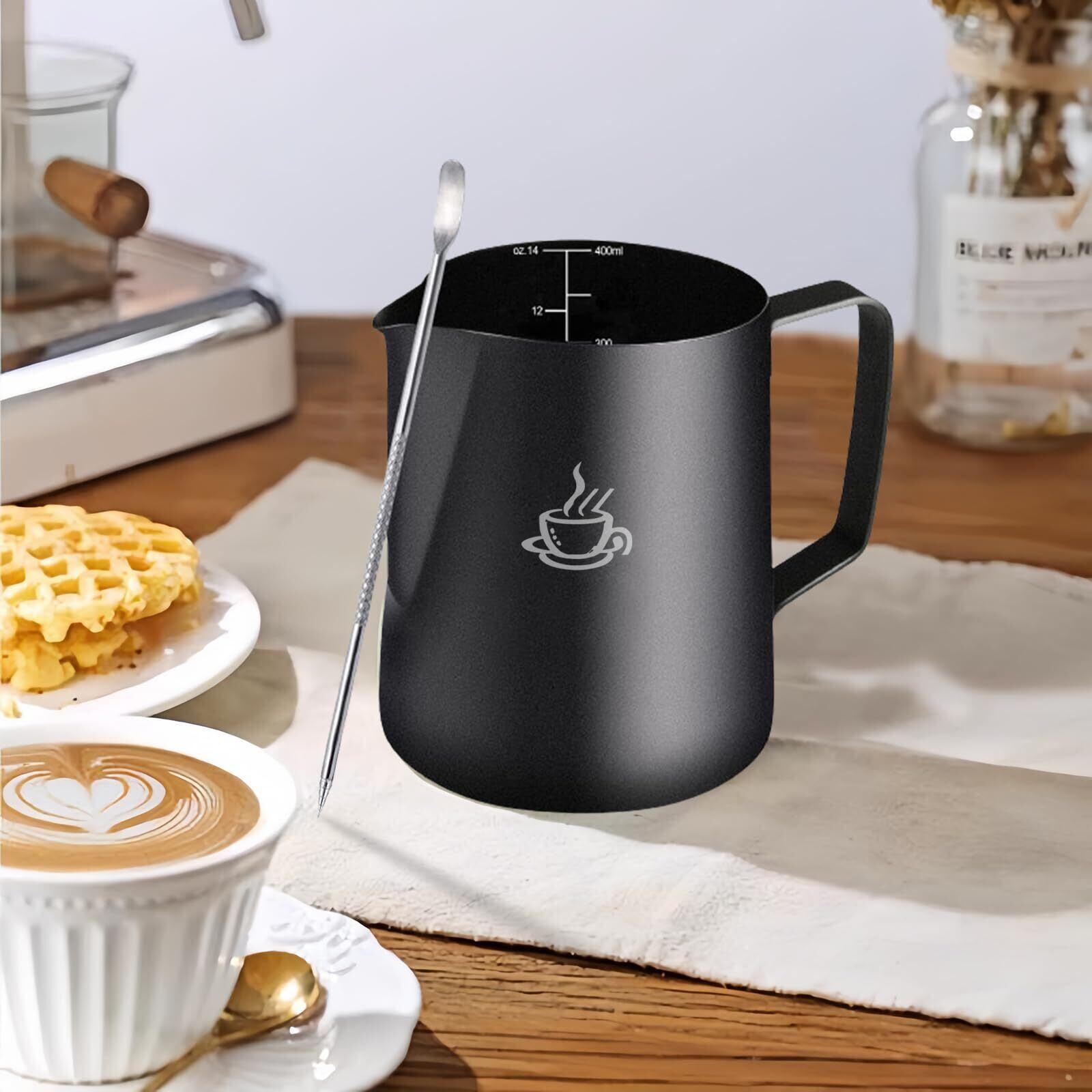 【数量限定】ミルクジャグ ミルクピッチャー 400ml/14oz 目盛り付き ステンレス製 コーヒーラテアート用 ミルク泡立て器ジャグ ドリンクピッチャー(black-400ml)