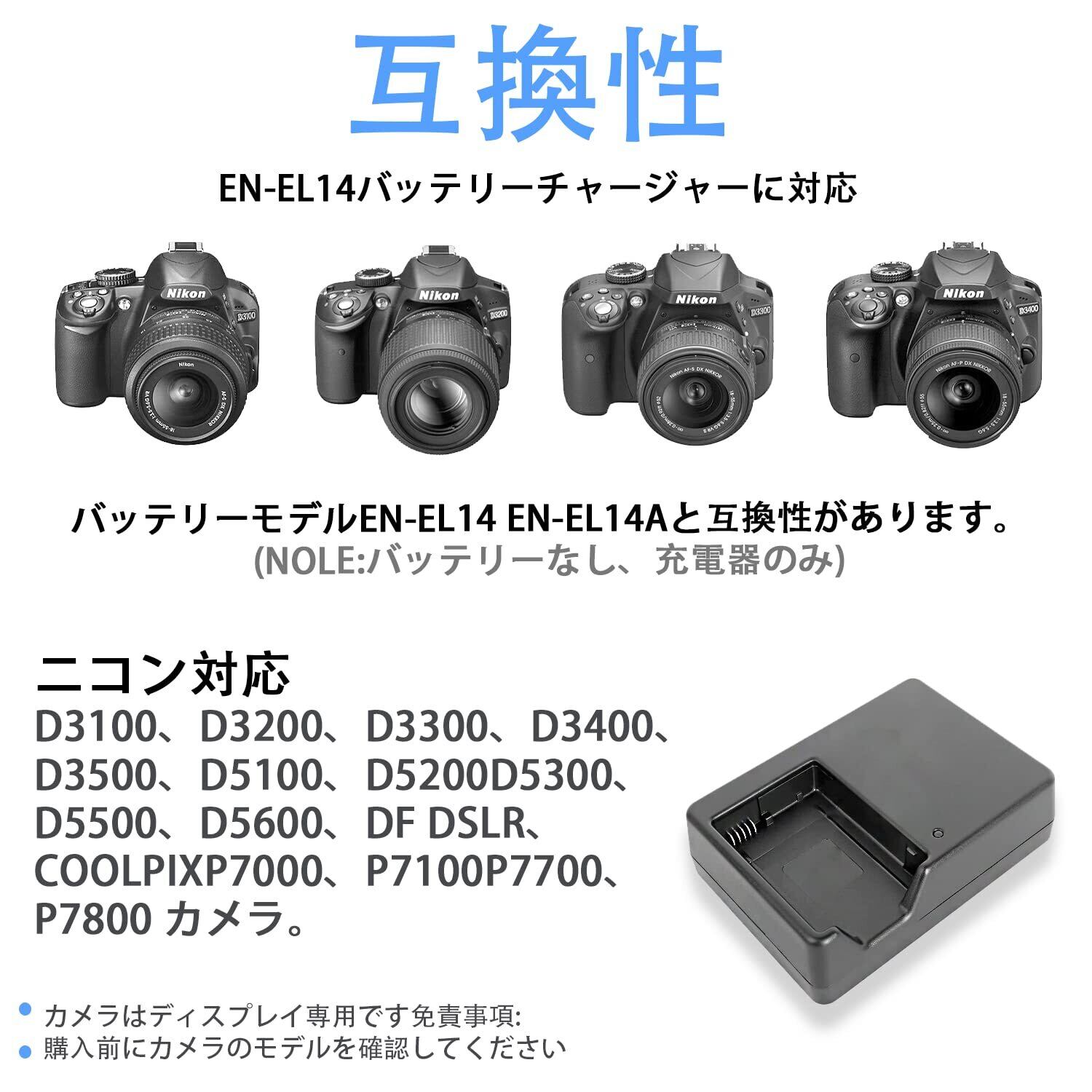 【対応製品】 互換性があります Nikon D3100 D3200 D3300 D3400 D3500 D5100 D5200 D5300 D5500 D5600 P7000 P7100P7700P7800と。バッテリーモデルEN-EL14 EN-EL14A(注:バッテリーなし、充電器のみ)。