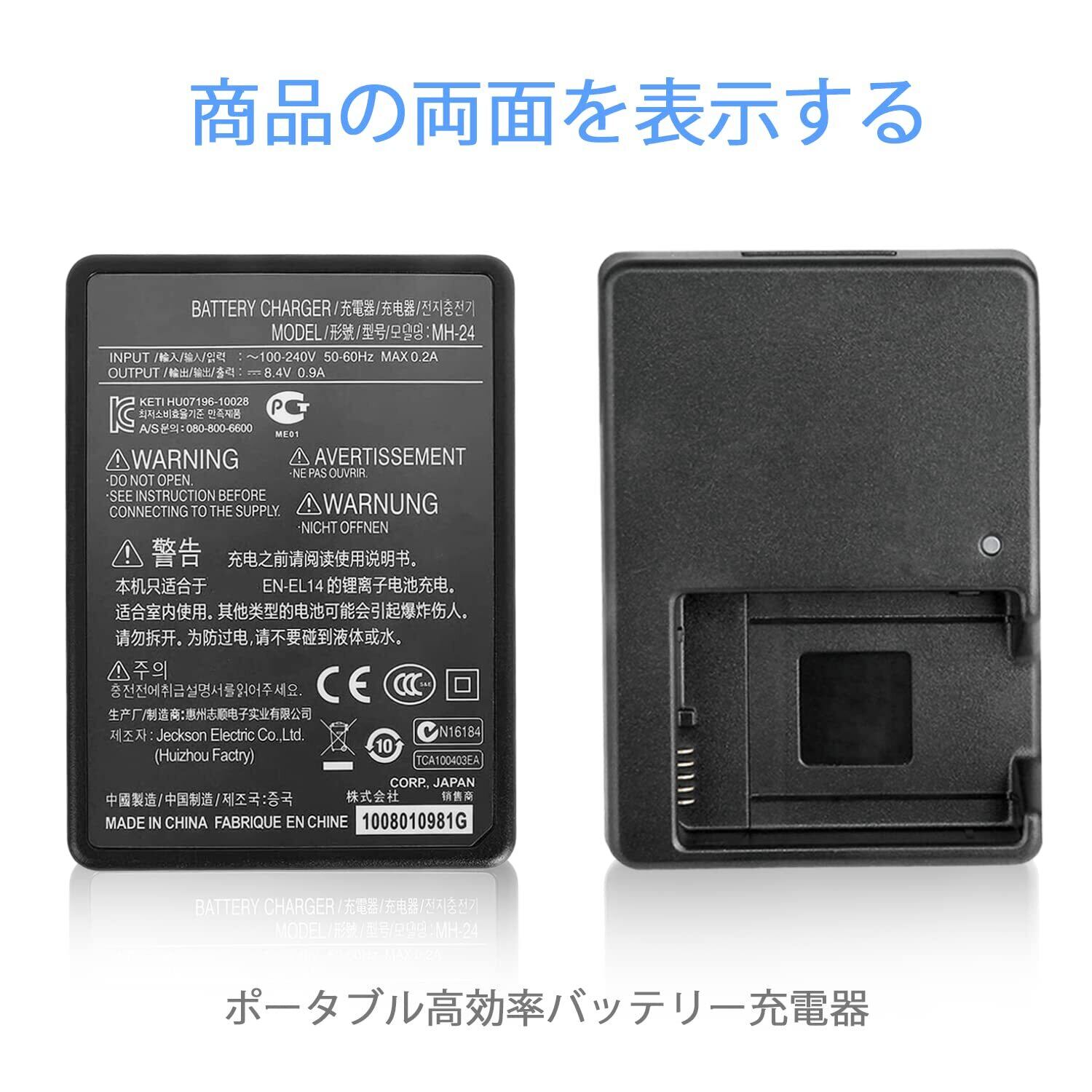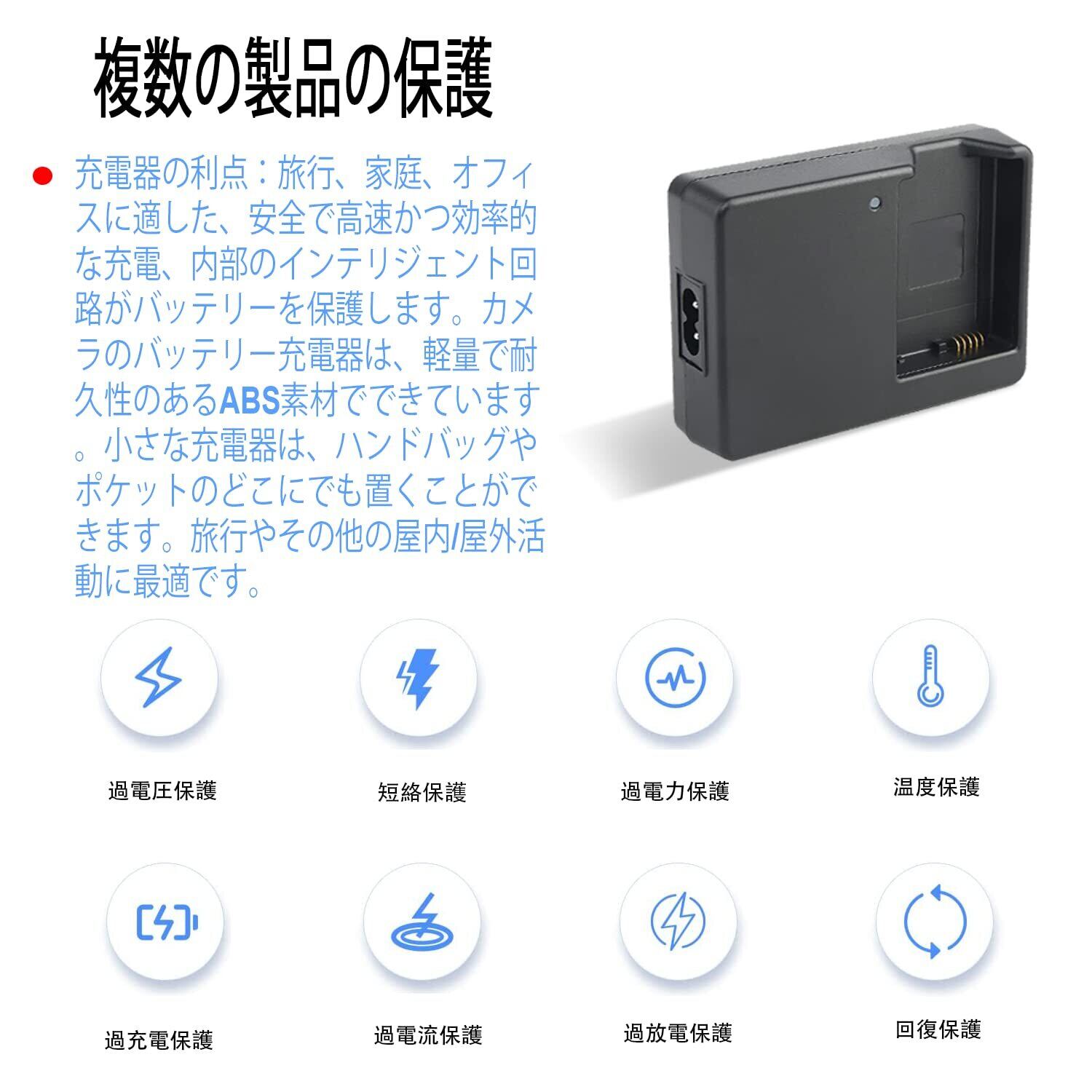 【製品仕様】 過負荷保護、過負荷保護、過電流保護、短絡保護などのIC保護機能を搭載し、カメラやバッテリーの損傷を防ぎます。