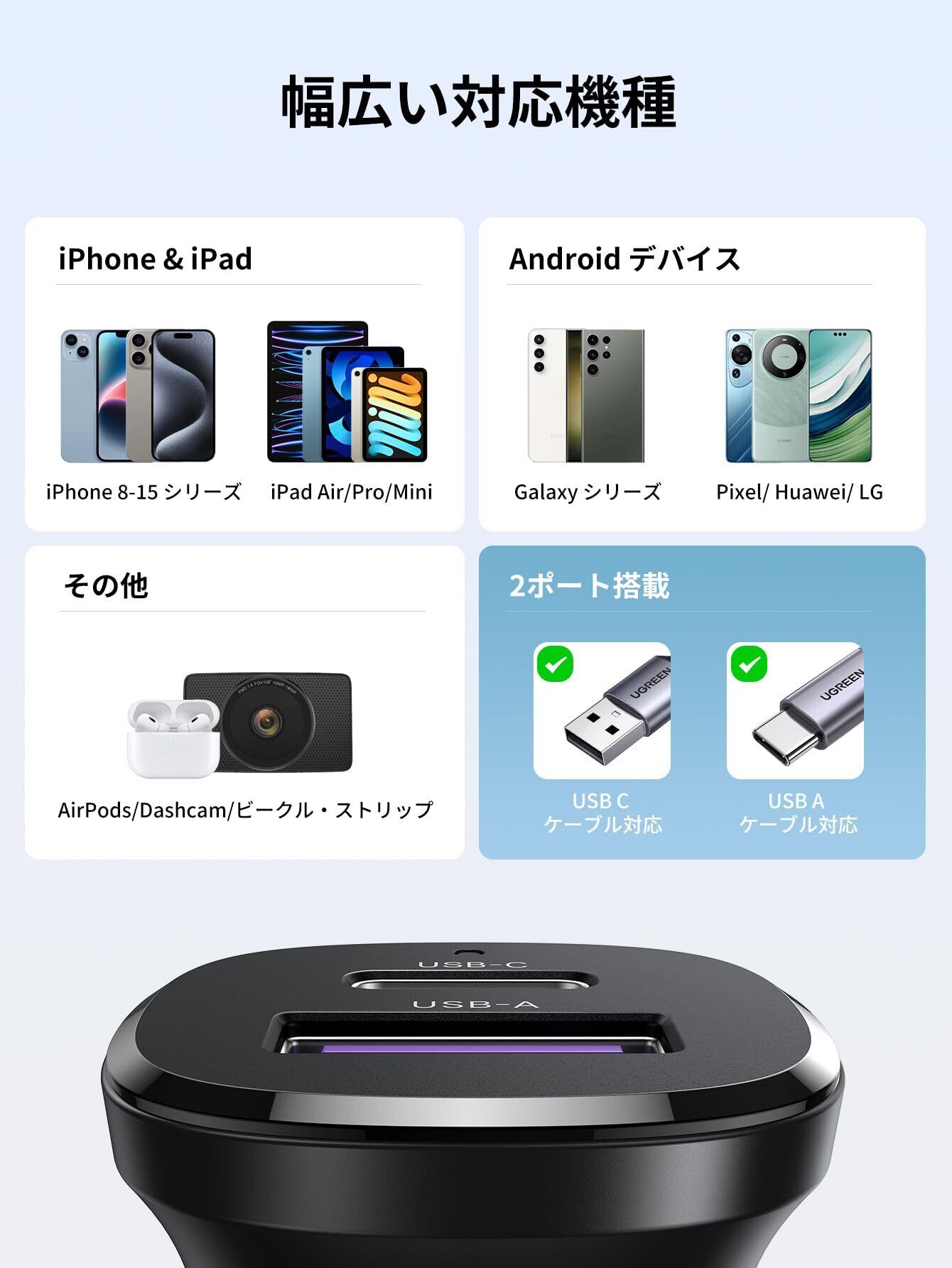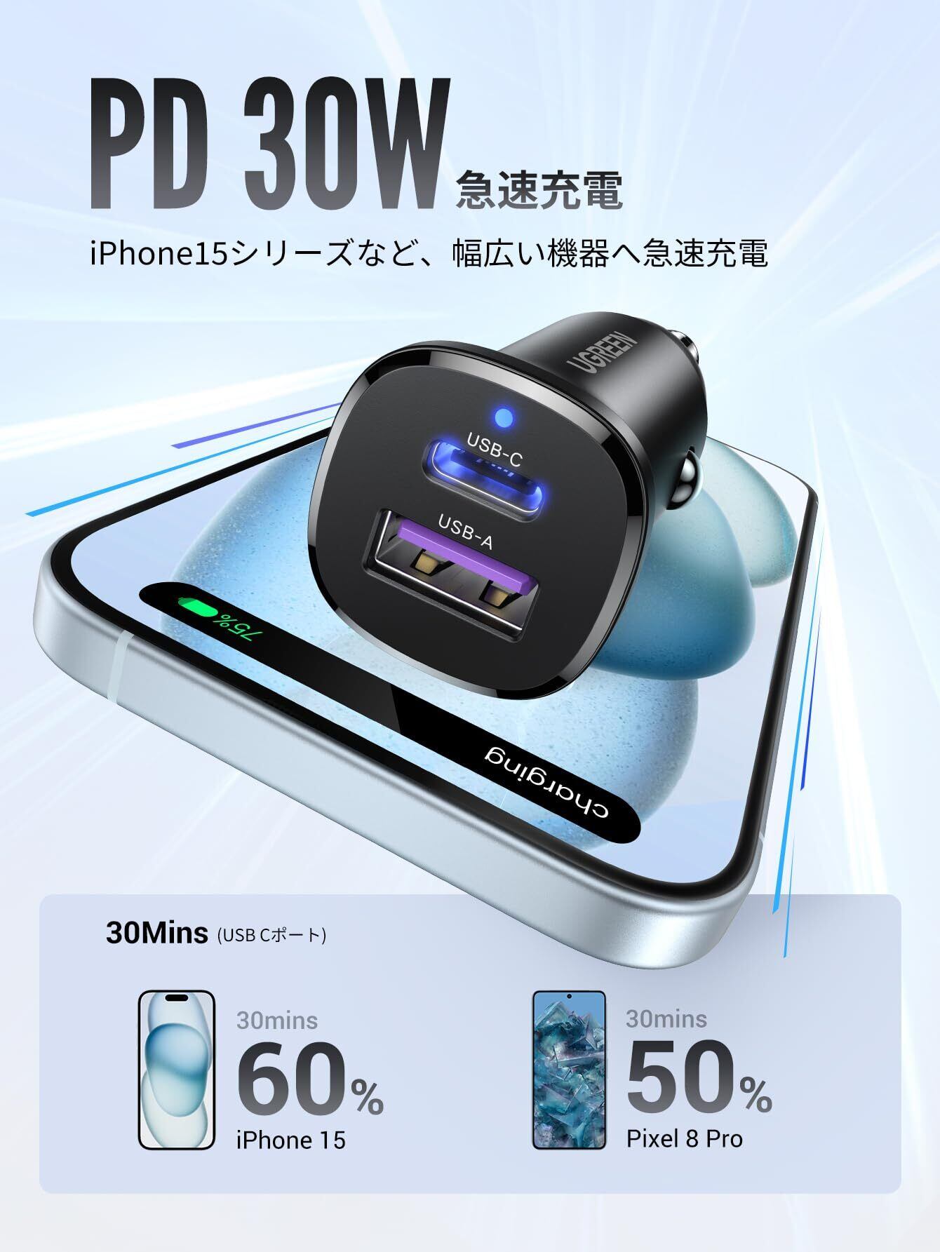 UGREEN シガーソケット USB C カーチャージャー 2ポート 52.5W【PD30W+SCP22.5W 急速充電】 PD3.0/QC4.0/PPS対応 12V・24V車対応 車載充電器 コンパクトサイズ 軽量 耐久性 車充電器 iPhone 16/iPhone15/ iPhone14/ iPhone13/Xperia/Galaxy/Android/iPadなどに対応
