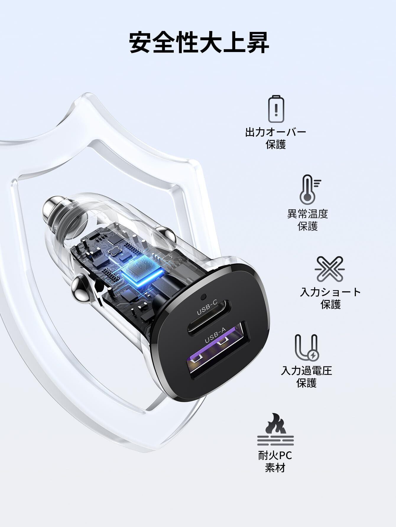 【賢く充電・マルチ安全保護システム搭載】サージ保護機能や電子回路のショート防止機能、温度管理など、UGREEN独自の多重保護システムにより安定で急速充電してお使いの機器を24時間守ります。又は本製品を通電するとLEDが青く点灯して、動作状態を一目瞭然。