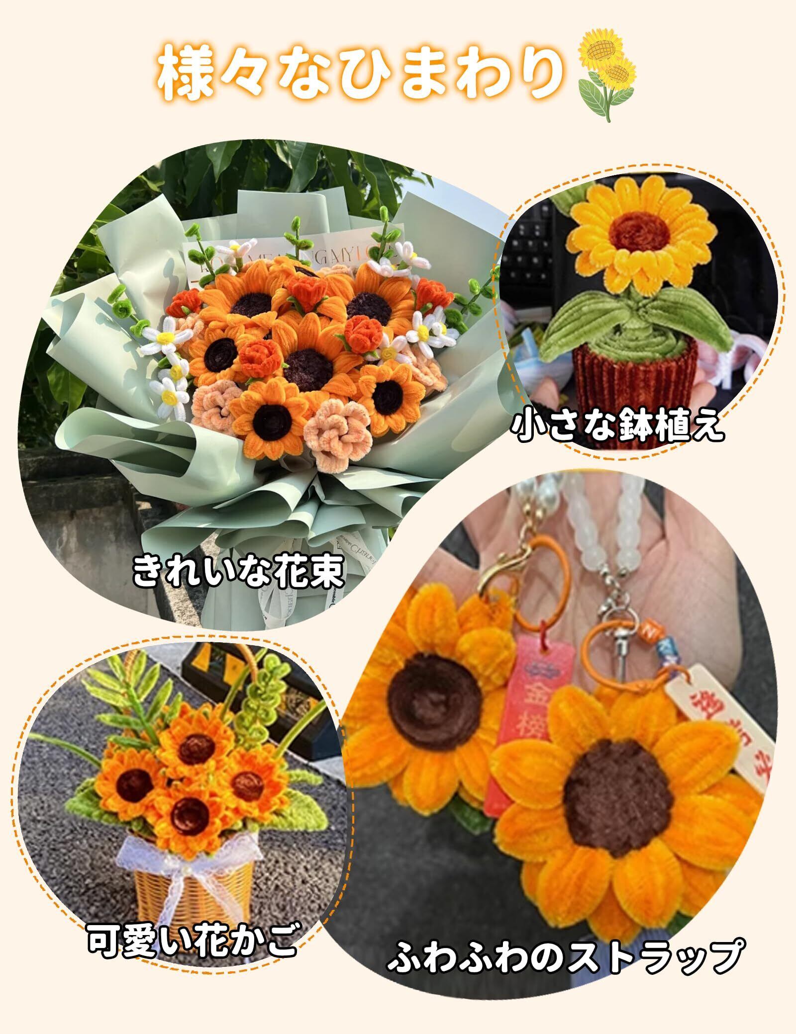【商品仕様】セット内容:オレンジ*約100本+グリーン*約100本+コーヒー色*約100本、人工花茎*20本、フラワーテープ*1個、ホットメルトスティック*5本。サイズ:手芸モール約30*0.6 cm、花茎の長さ約30cm。お客様のご意見を伺って、改良を加え、今は商品セットに説明書を付属します