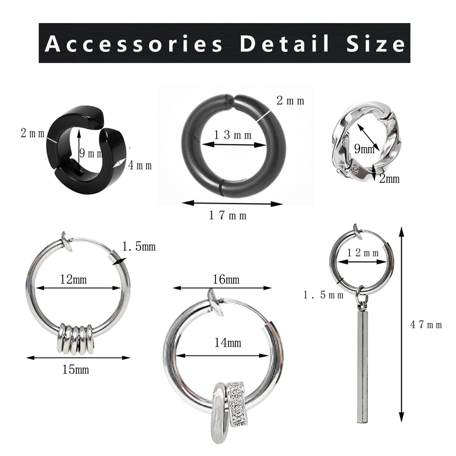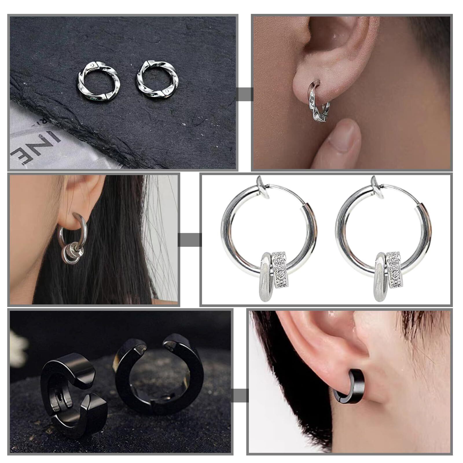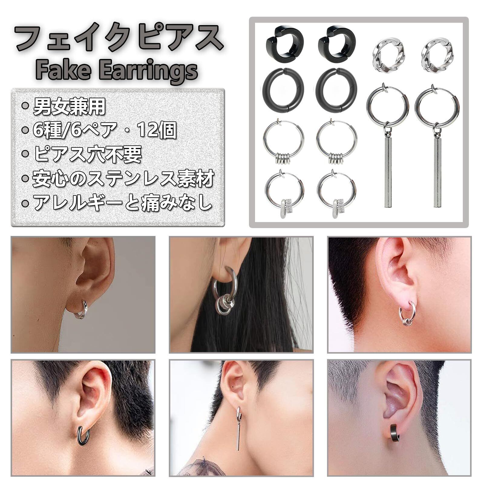 【種類豊富な6ペアイヤリングメンズ】フェイクピアス( イヤーカフ)のお得なシルバーとブラック、6種の組み合わせで合計12個セットです!イヤリングセットにはシンプルなスティックの揺れるイヤリング、フープに4本のリング、ねじったフープイヤリングなど、パネタイプのフェイクピアスは3ペアあり、挟むタイプのイヤーカフは3ペアあり、合計6タイプが含まれています。