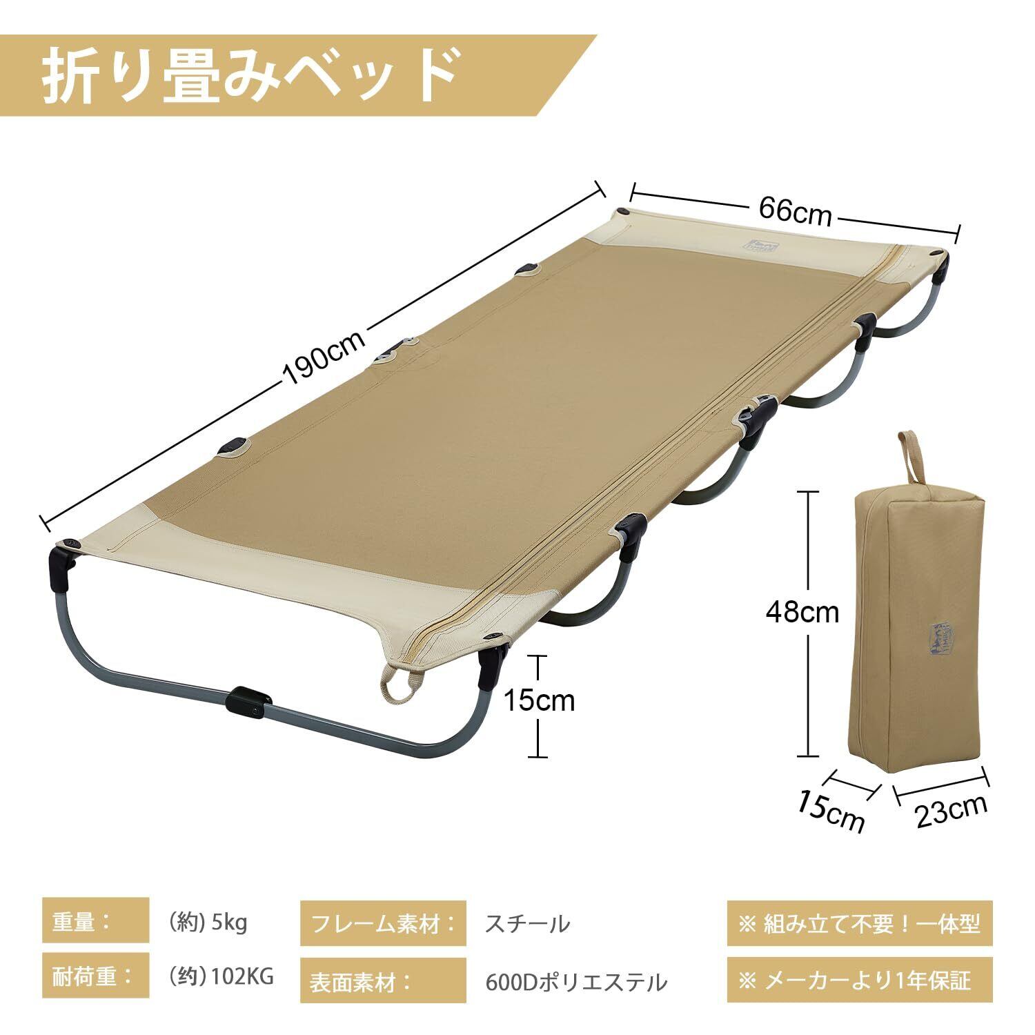 →【キャンプコットの詳細】①、展開時サイズ:(約)長さ205.74cm*幅67.56cm*高さ15cm ; 収納時サイズ:(約)43.89cm*19.38cm*12.4cm ; ②、耐荷重:(約)102kg ; 収納袋を含む総重量:(約)5kg ; ③、フレーム素材:スチール ; 表面素材:600Dポリエステル