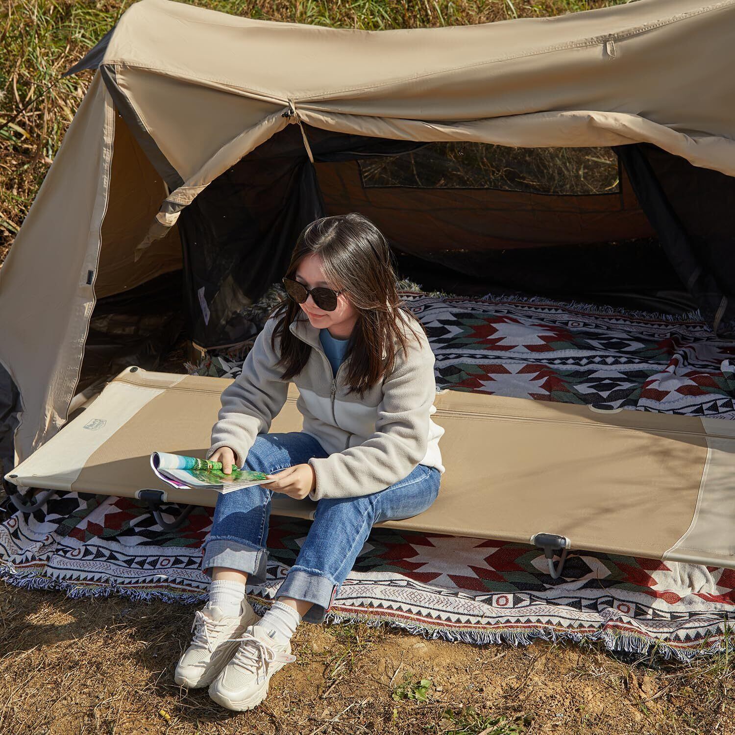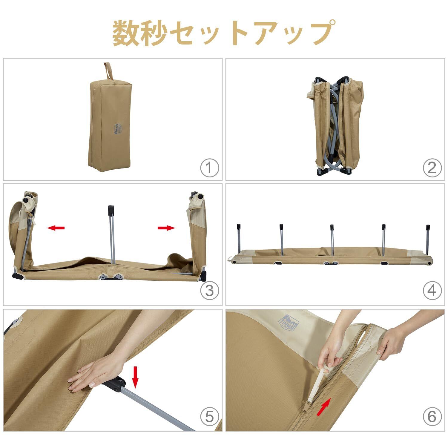 →【寝心地最高なテントコット】①、ロータイプなので、テント内に使用しても狭く感じない!通気性に優れいて地面の凸凹の影響も受けにくい。 ②、収納ケース付で持ち運びも楽々、使用後はコンパクトに収納できます。③、一体式設計により脚部が崩れることはなく、設置後の安定性が抜群です。