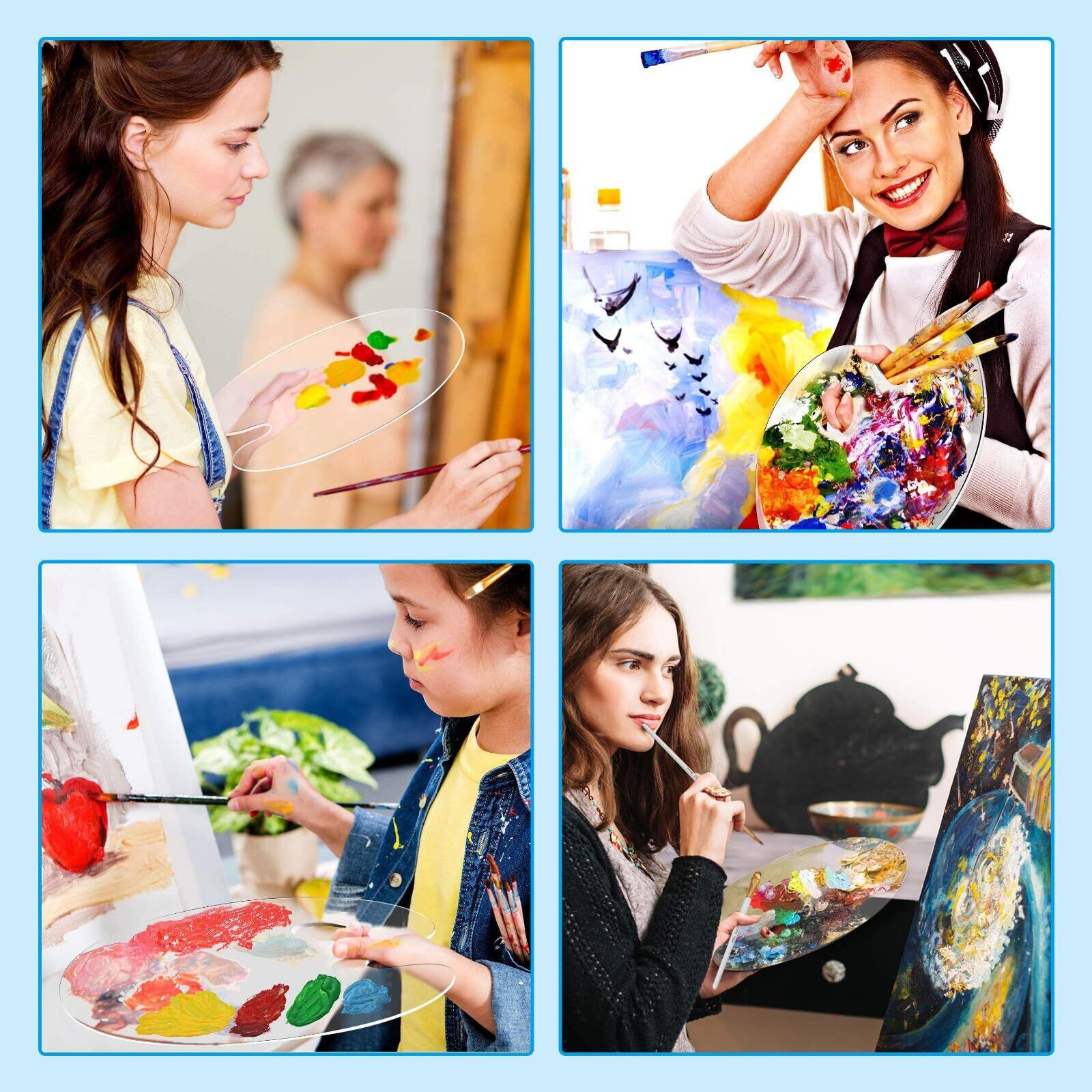 【水彩パレット】親指の穴が楕円形の楕円形のペイントトレイは軽量で、両面が使用でき、左利き用と右利き用に適しています。軽くて持ち運びに便利なデザインで外でもスケッチが可能です。塗った後はすぐに洗い流せます。