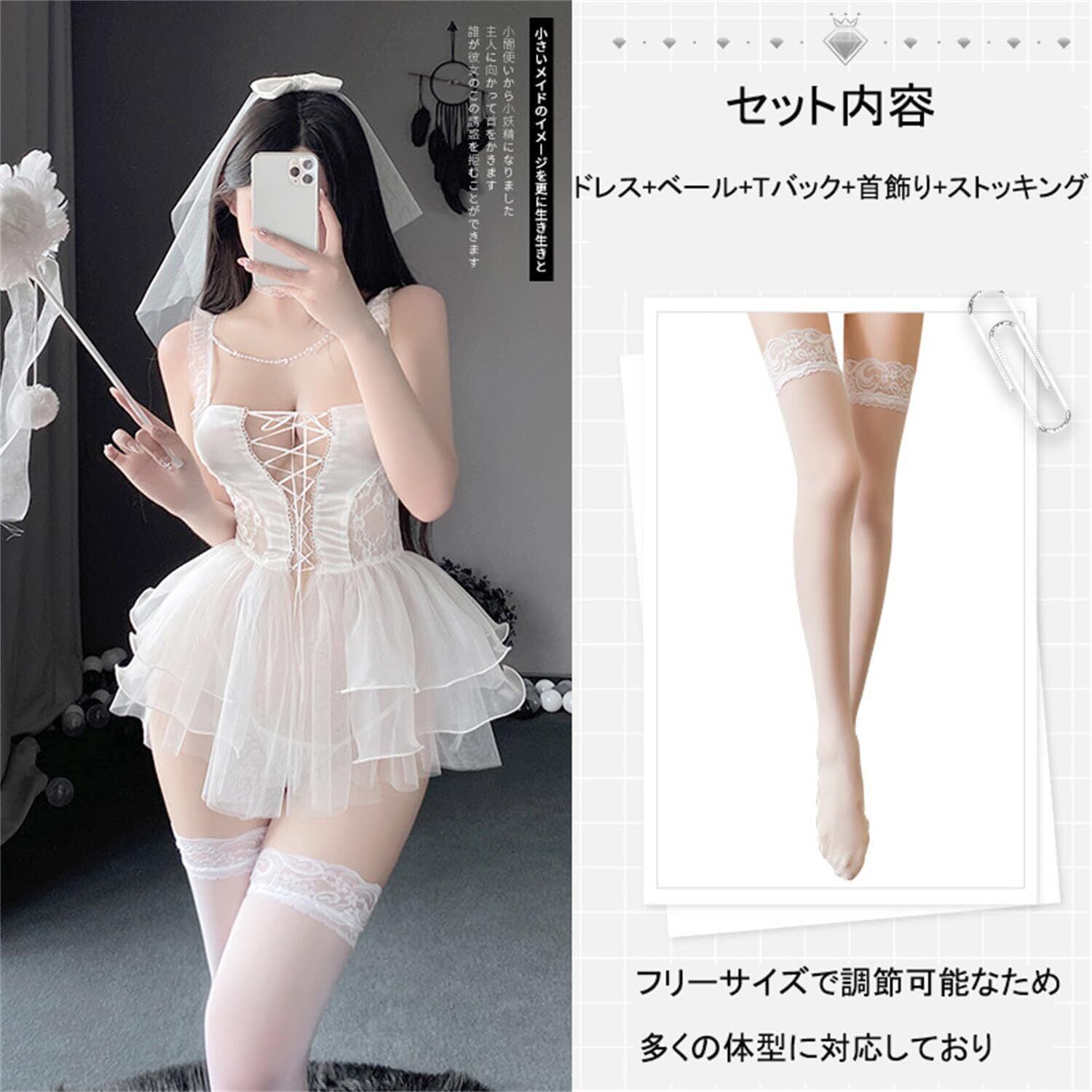 [harukita] ウェディングドレス コスプレ セクシー メイド服 仮装 可愛い カチューシャ レース ストッキング かわいい プレゼント 演出 衣装 結婚式 ドレス 綺麗なベビードール レース ベール リボン 飾り Tバック 5点セット