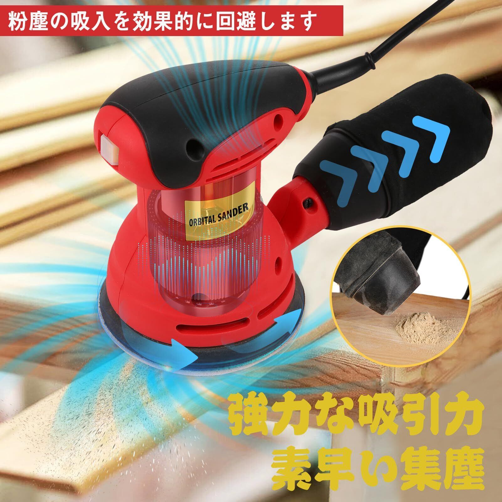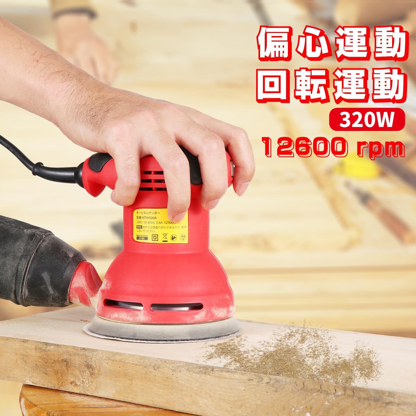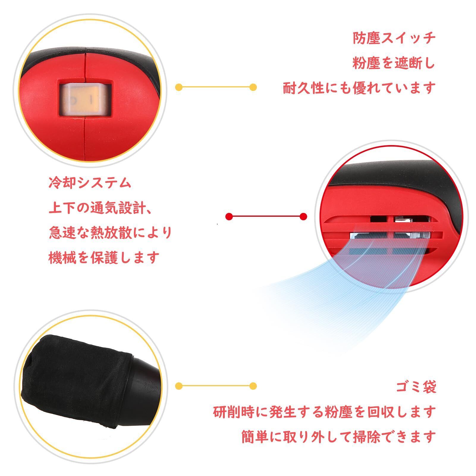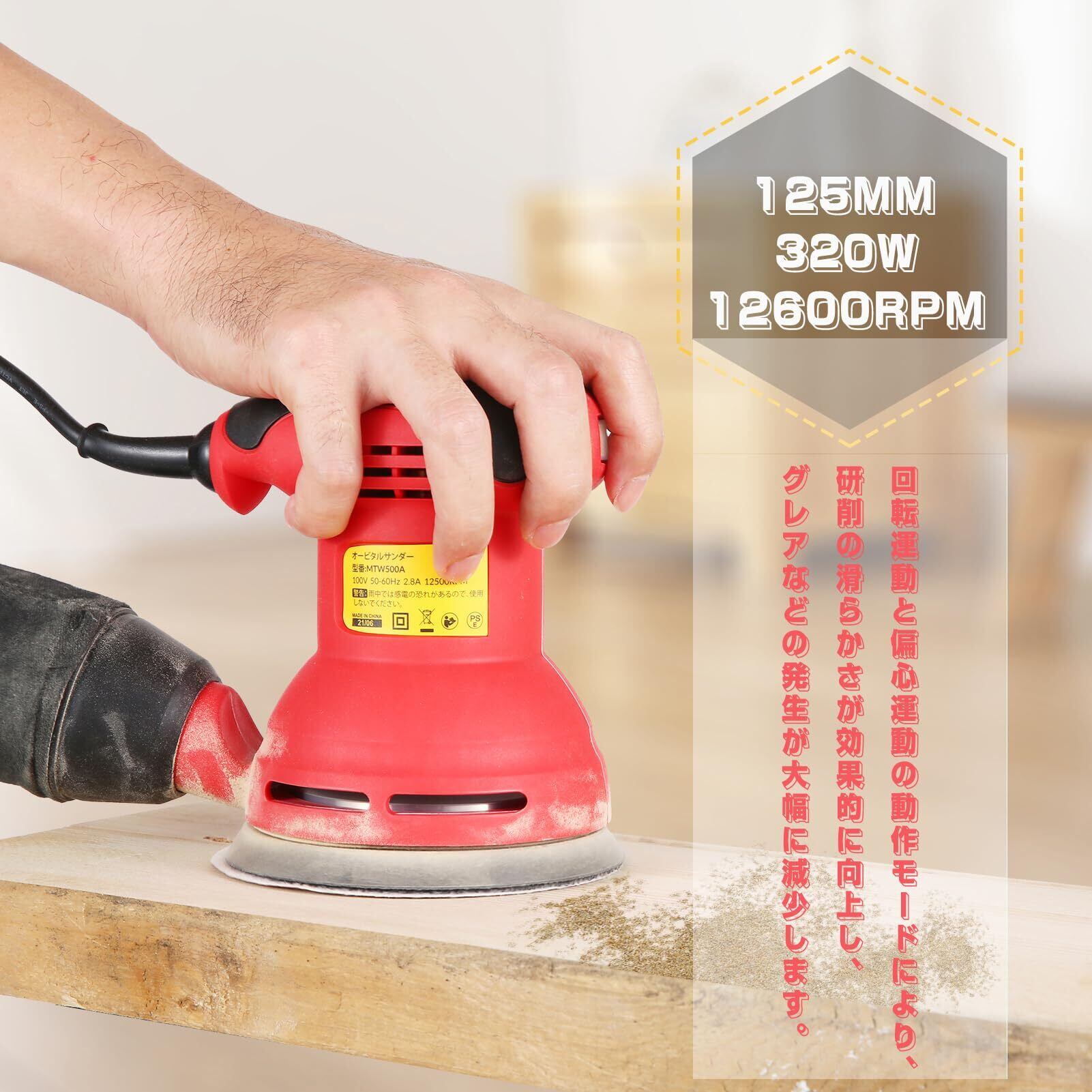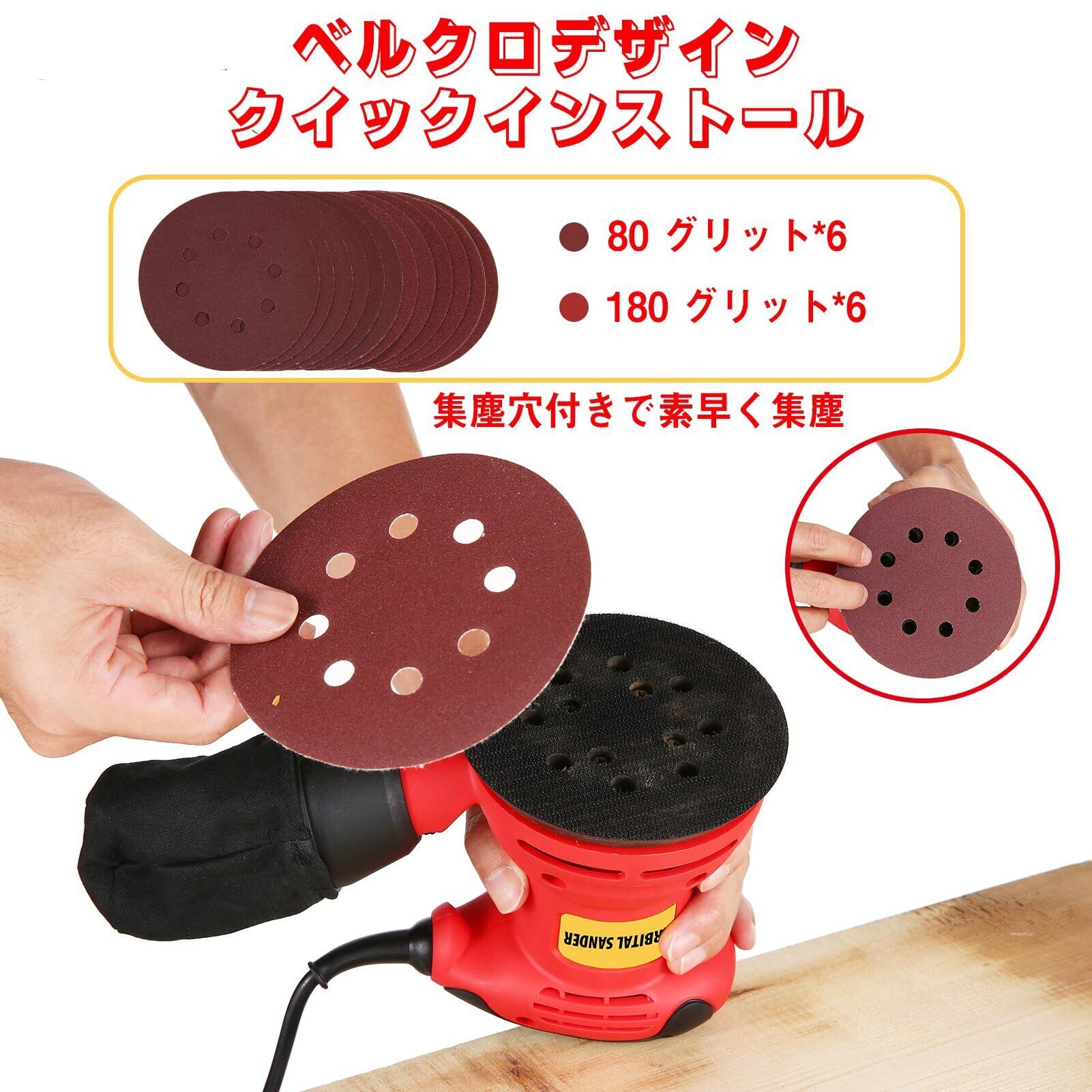 【内容物】-パッケージ内容: 電動ランダムサンダー 、サンドペーパー(80および180グリット)12枚、日本語取扱説明書1冊。届いたらすぐに使えるのでとても便利です。