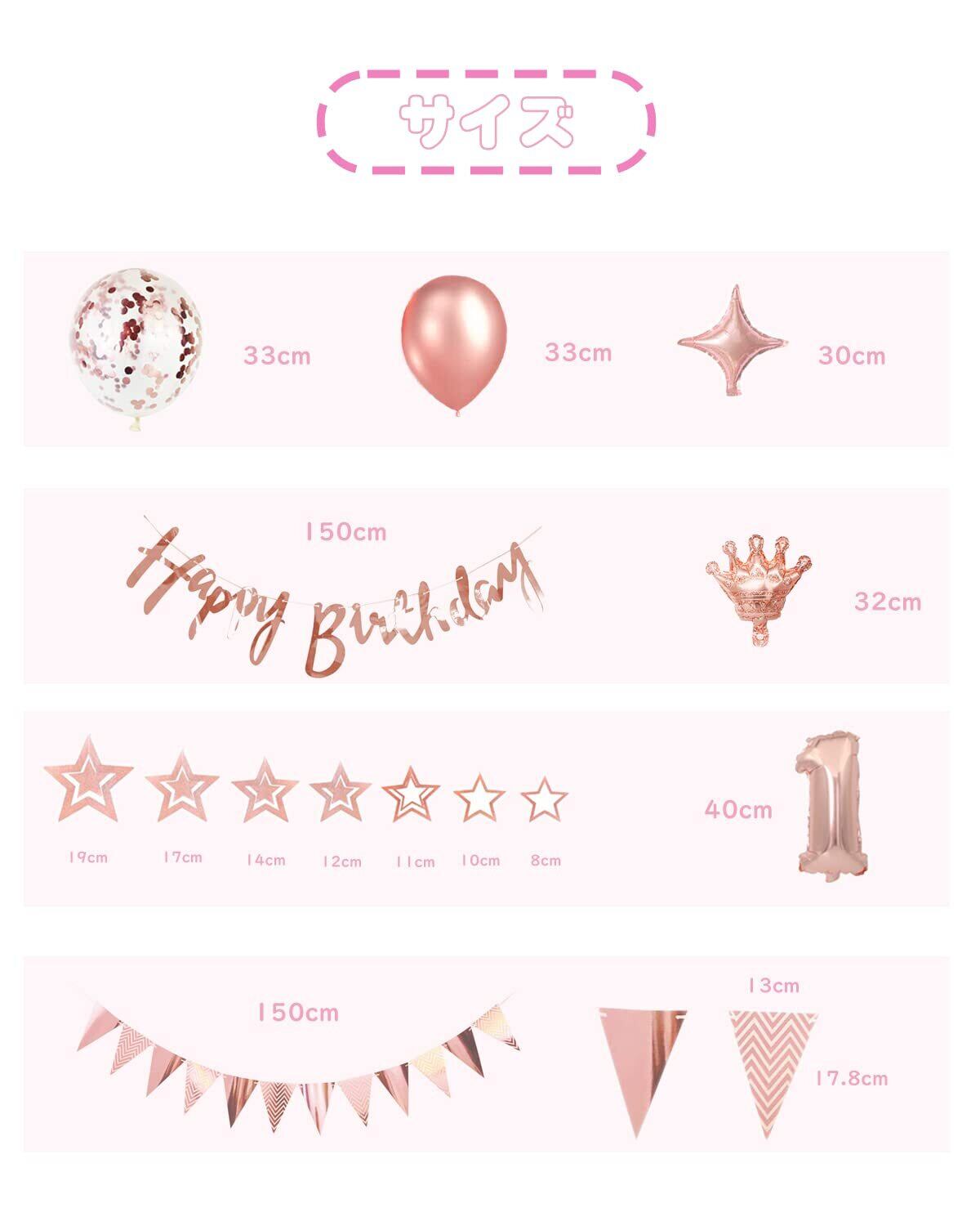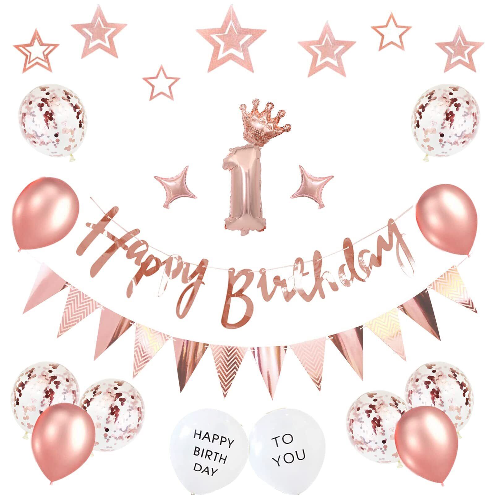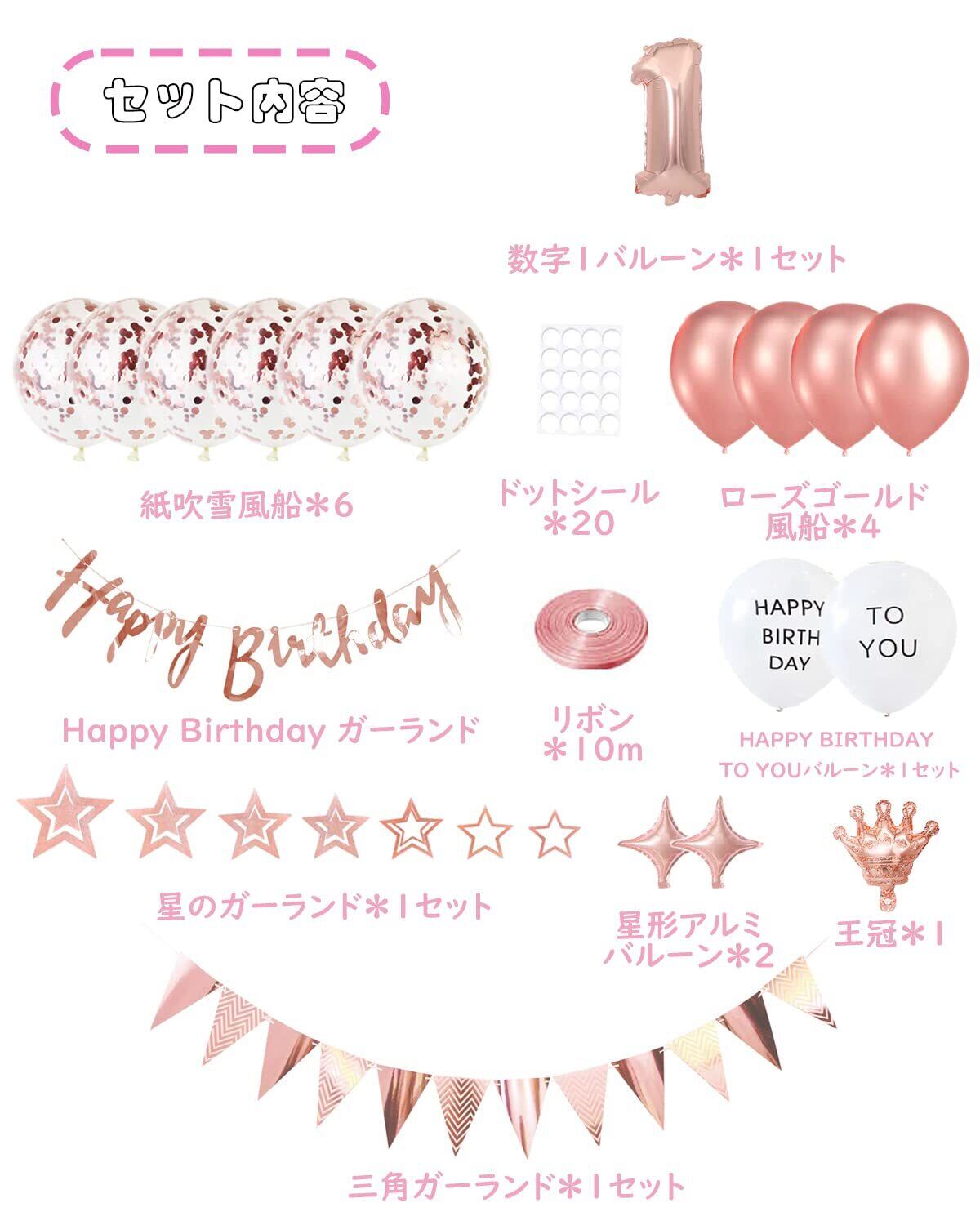 簡単カワイイ· 華麗な感じ:セット内容:HAPPY BIRTHDAYガーランド×1組、星のガーランド×1組、フラッグガーランド×1組、数字バルーン「1」×1組(約40㎝)、クラウン風船×1個、ダイヤモンド風船×2個、ローズゴールドゴムバルーン×4個、ローズゴールド紙吹雪バルーン×6個、HAPPY BIRTHDAY TO YOU バルーン×1組、リボン(約10m)×1個、ドットシール(約20点)×1枚