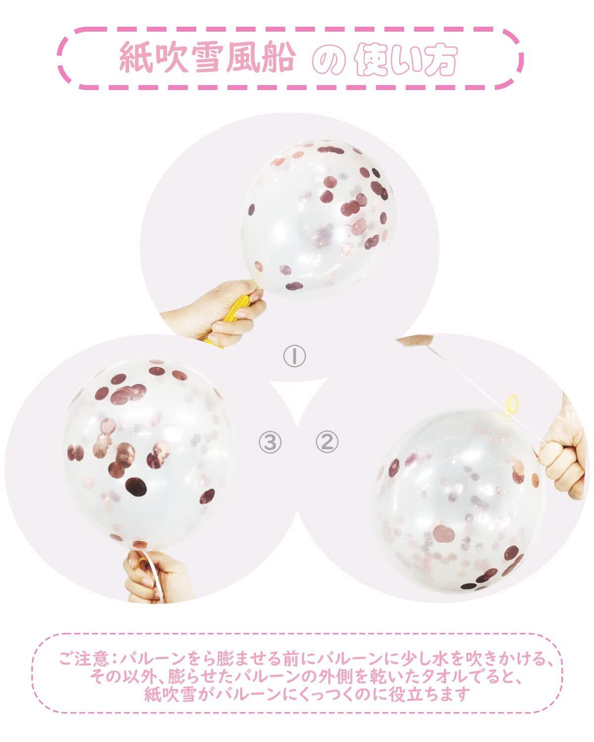 紙吹雪をキレイ散らすためには、風船を膨らませる前に少量の水を吹きかけてください . また静電気を利用して風船の外側を乾いたタオルで摩りますと紙吹雪が風船ににくっつきやすくなります