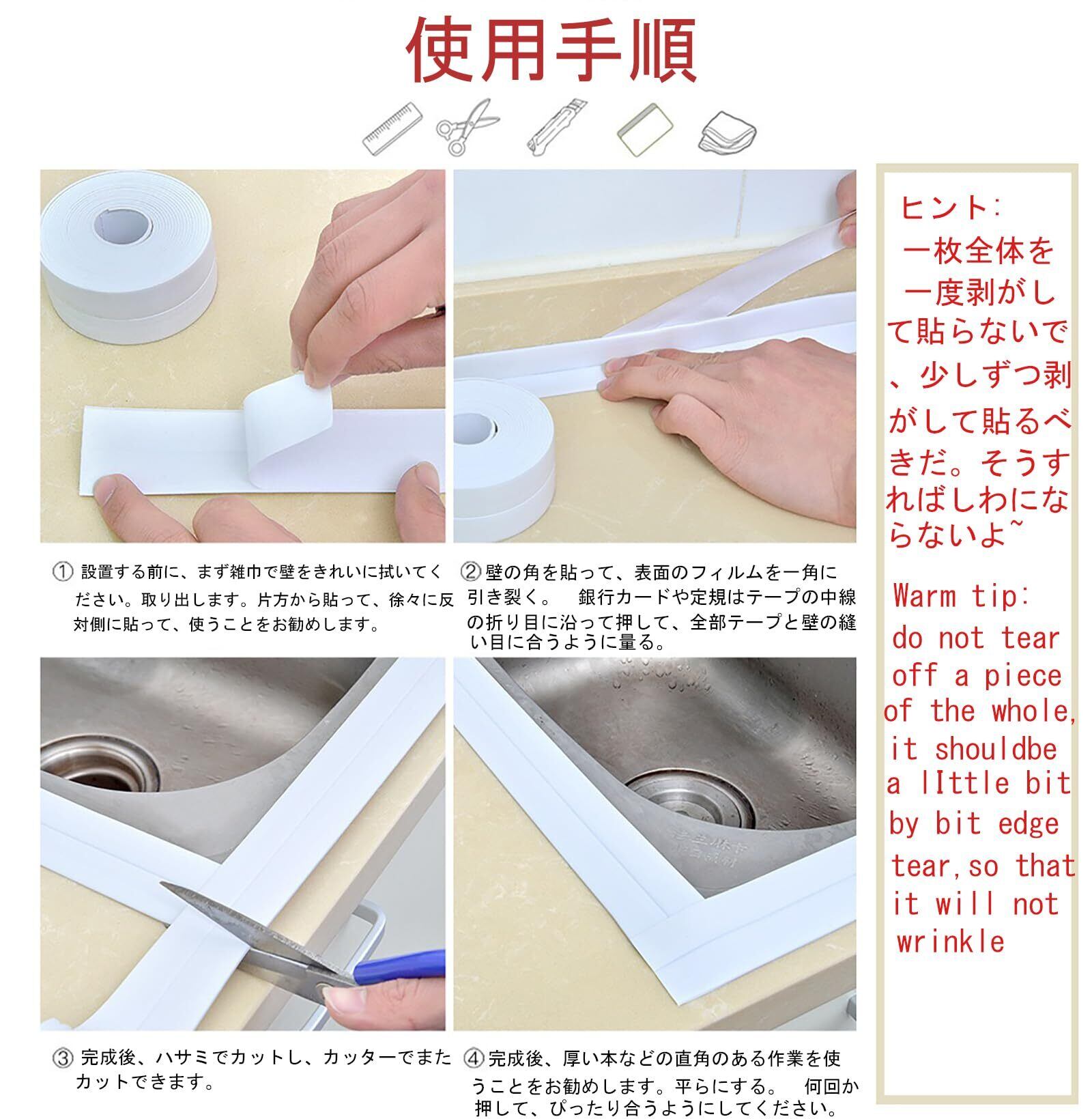 簡単な使用方法:普通の補修テープとは異なり、本防カビテープのサイズは自由にカットできます。特別な道具を使う必要がなく、適当な長さを切った後、テーブルの汚れを除去し、乾燥して貼りたいところによく押せばいいです。分解もとても簡単で、透明感が高いです。低温で使うと、ドライヤーで温めると、接着が加速されます。