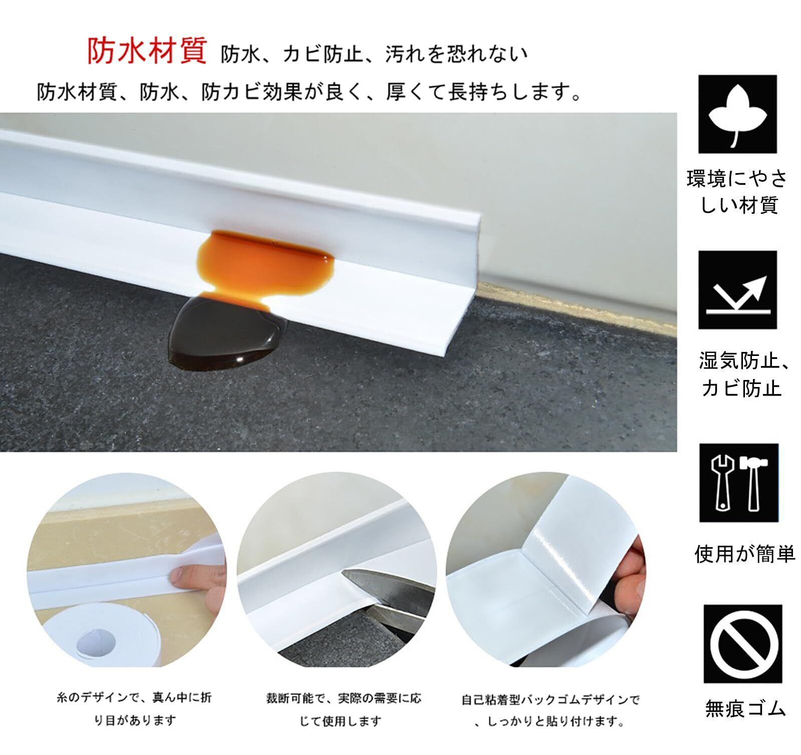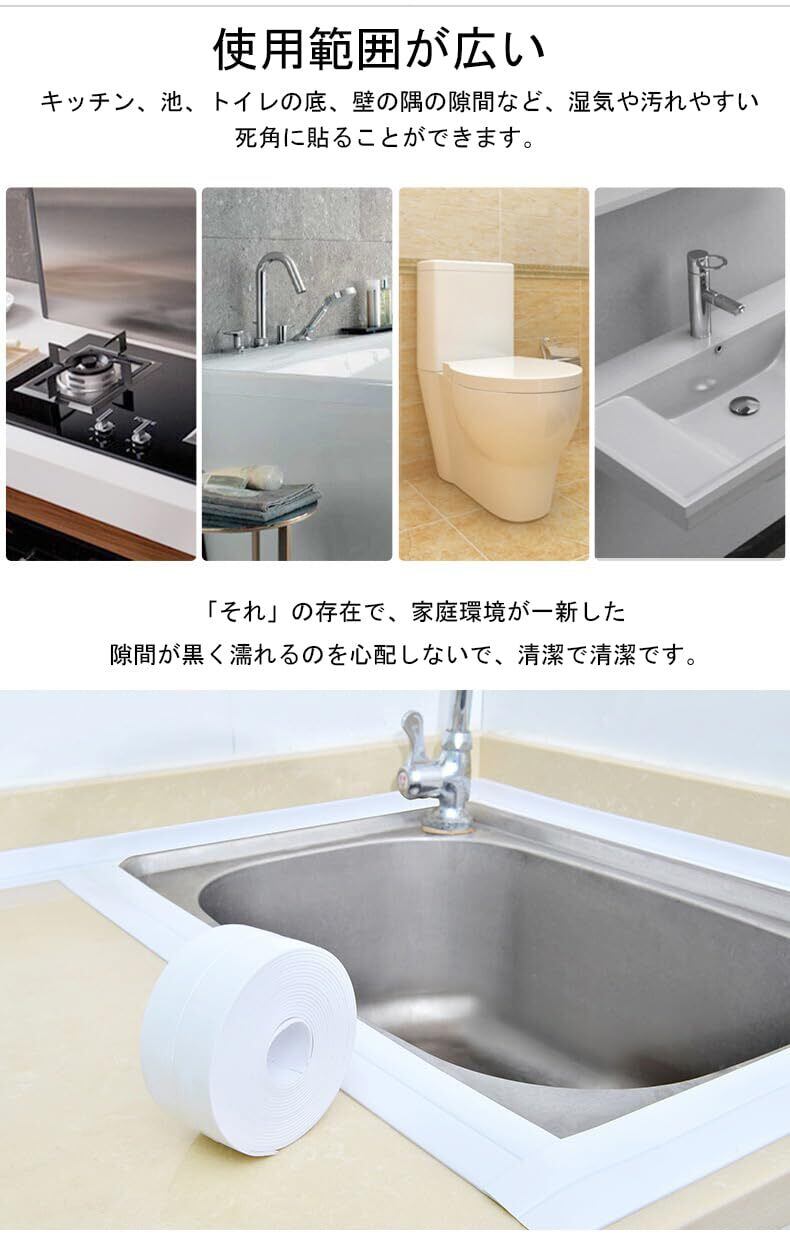 幅広い用途:タイル、ガラス、プラスチック、金属などの滑らかな表面に貼ります。例えば、洗面台、洗浄台、浴槽、水輪の隙間などです。溜まりやすく、掃除できない角にこのカビを貼って遮蔽テープを防ぐと、隙間のカビと汚れを強力に防ぎます!水、汚れ、カビ、ほこりなどを防ぐことができるので、玄関から客室、浴室、洗面所、キッチン、水周辺、トイレ、浴室、浴槽、トイレ、浴室、洗面台など様々な場所を保護することができます。(柔らかくて曲面、凹凸面にもよく適応できるので、様々なものに対応できます。形状)