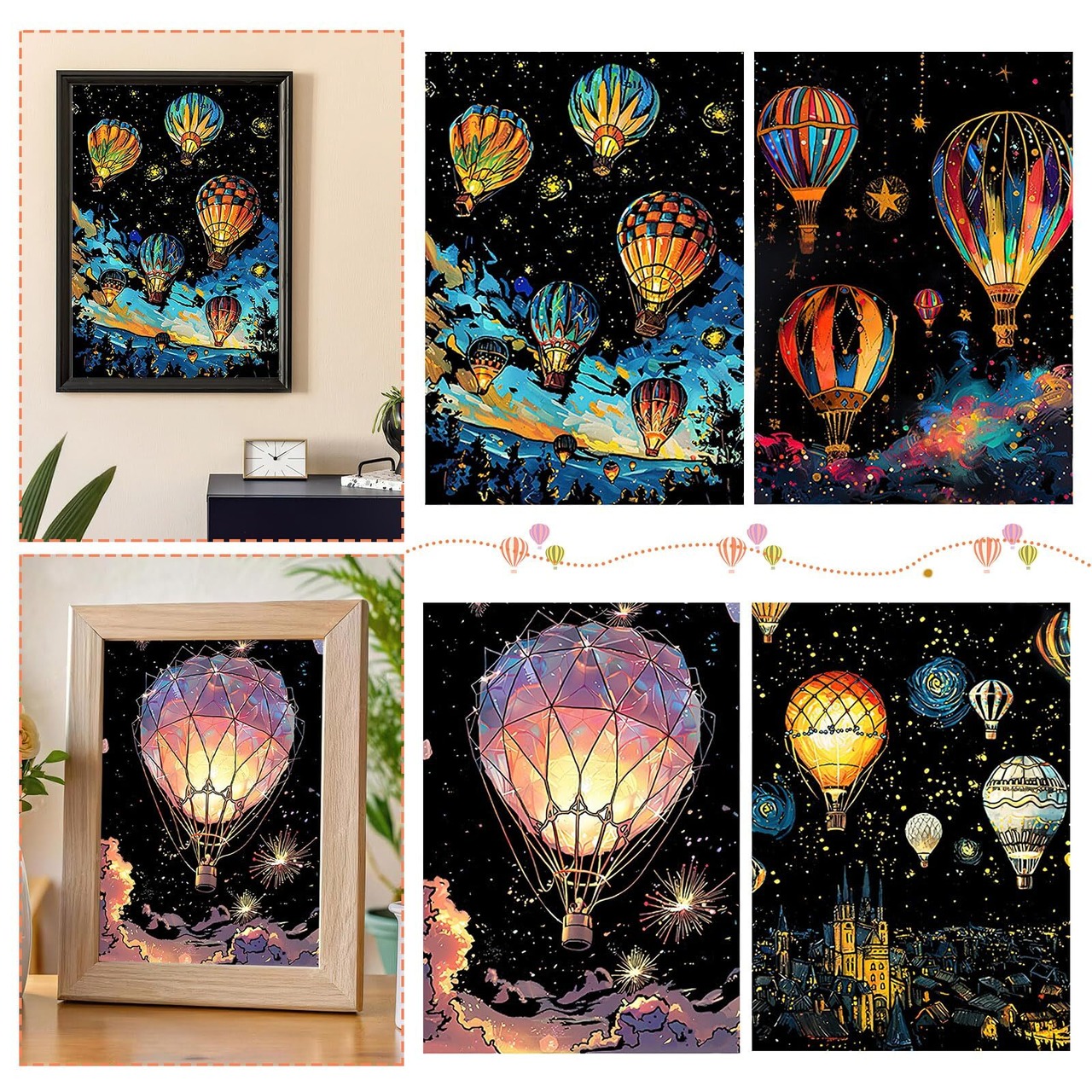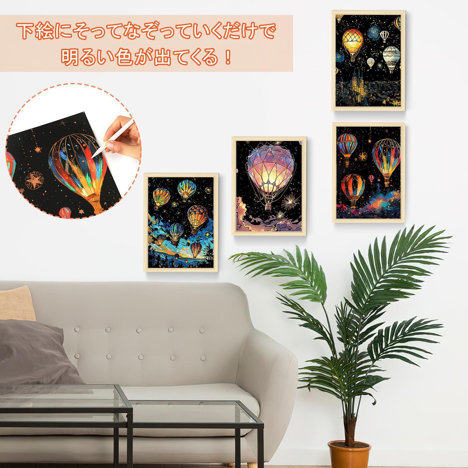 デザイン:これらのスクラッチアートはすべて熱気球のイメージを採用しますが、デザインがそれぞれ異なります。シンプルでエレガントなラインと明るい色が組み合わさって、絵画が生き生きと見え、神秘的な雰囲気が溢れています