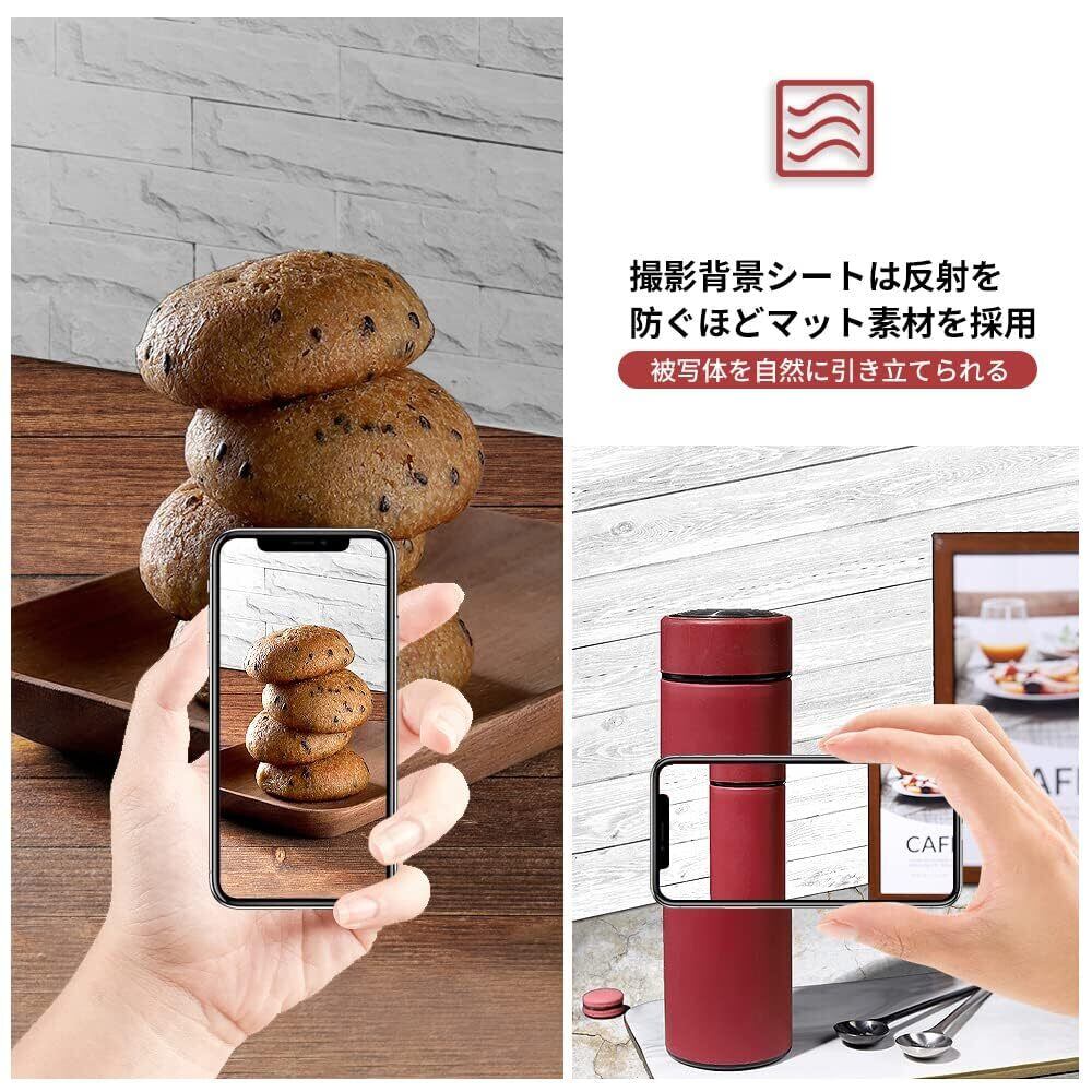 【注意事項】表面にフイルムで覆われて、やや防水できまが、縁部分は防水できませんので、ご使用の時はご注意ください。汚れがあるとき乾いた布で軽く拭いてください。撮影背景シートを耐熱加工を施しておりません。熱食物の撮影にお勧めいたしません。