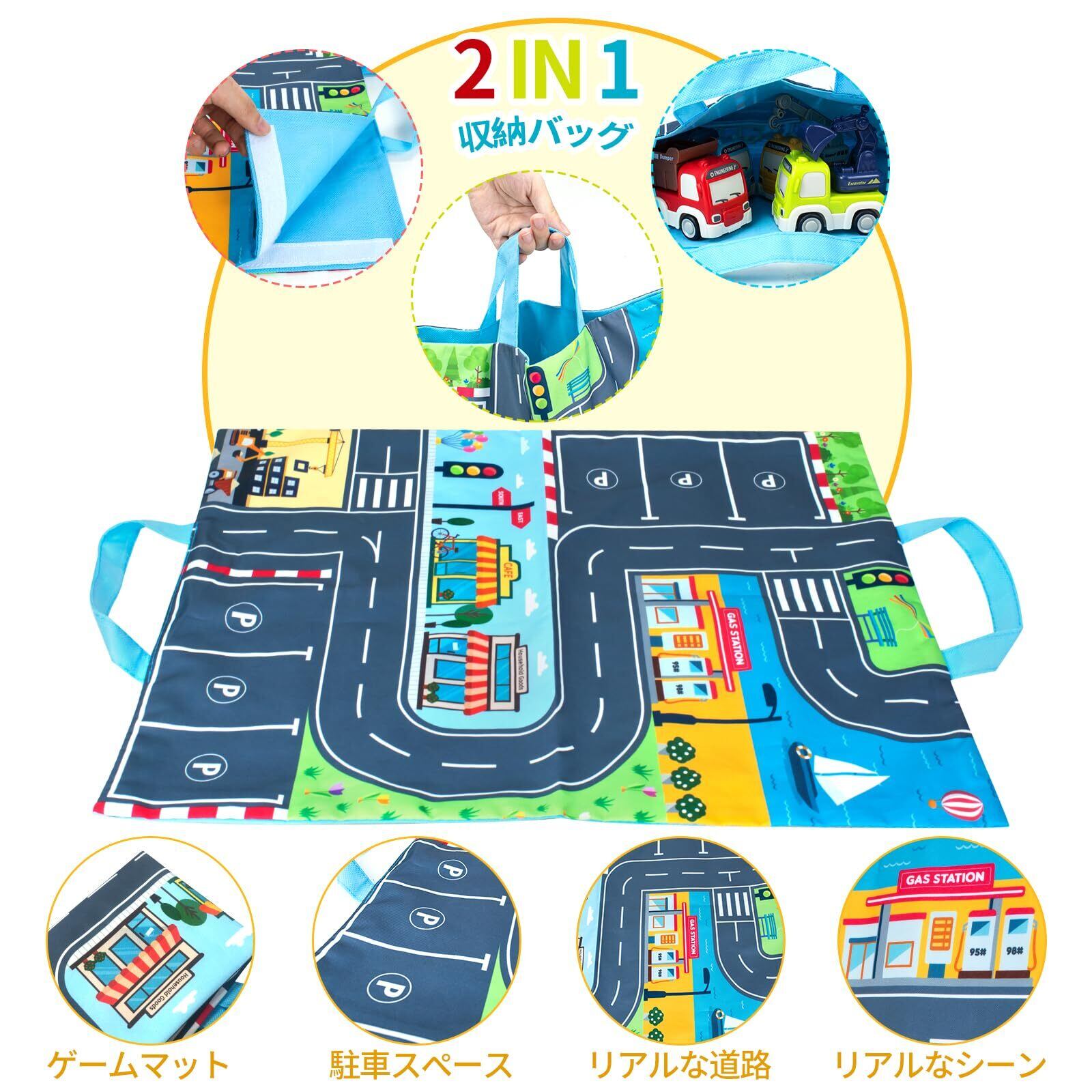 【2IN1カーマット】収納バッグにも、プレイマットにもなります。地図や情景部品も付いていて、柔らかい不織布でできています。4台の車おもちゃをセットして、子供が車を遊ぶとき、収納バッグを広げて、車のゲームマットになります。