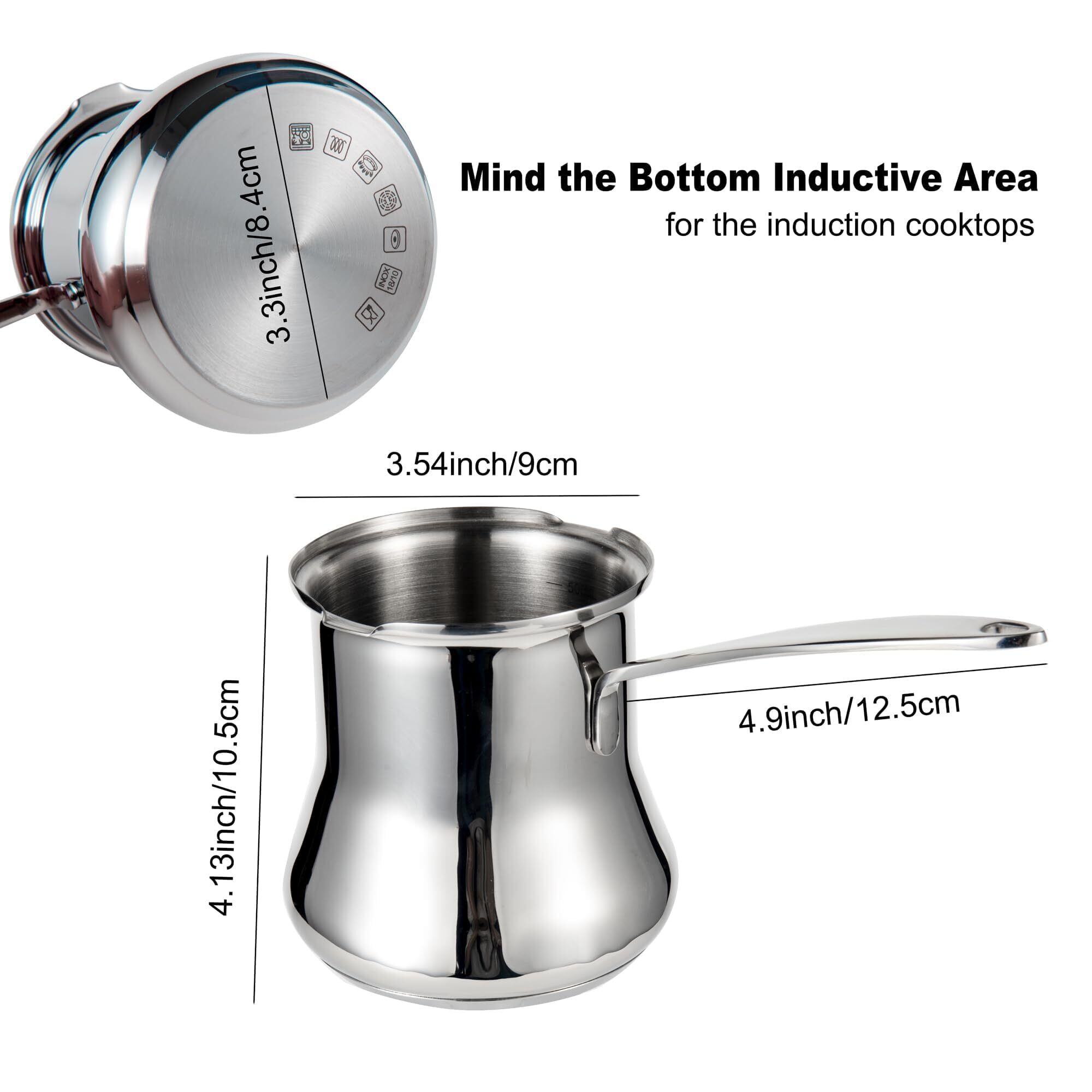 ミルクパンのサイズ:直径9cm 底部直径8.4cm 高10.5cm ハンドル長12.5cm 重量:432g カラー:シルバー 材質:ステンレス 容量:500ml (ご購入前には、ご使用のIHが使用できる鍋サイズ(直径等)の確認が必要です。ミルクパンの底部直径は8.4cmですが、IHに反応しませんの場合はIH調理器具の説明を良く見ると、適切な鍋底直径を確認してください。また、IH調理器具メーカーに問い合わせることで、具体的な対応策や推奨サイズを確認することもおすすめです。)