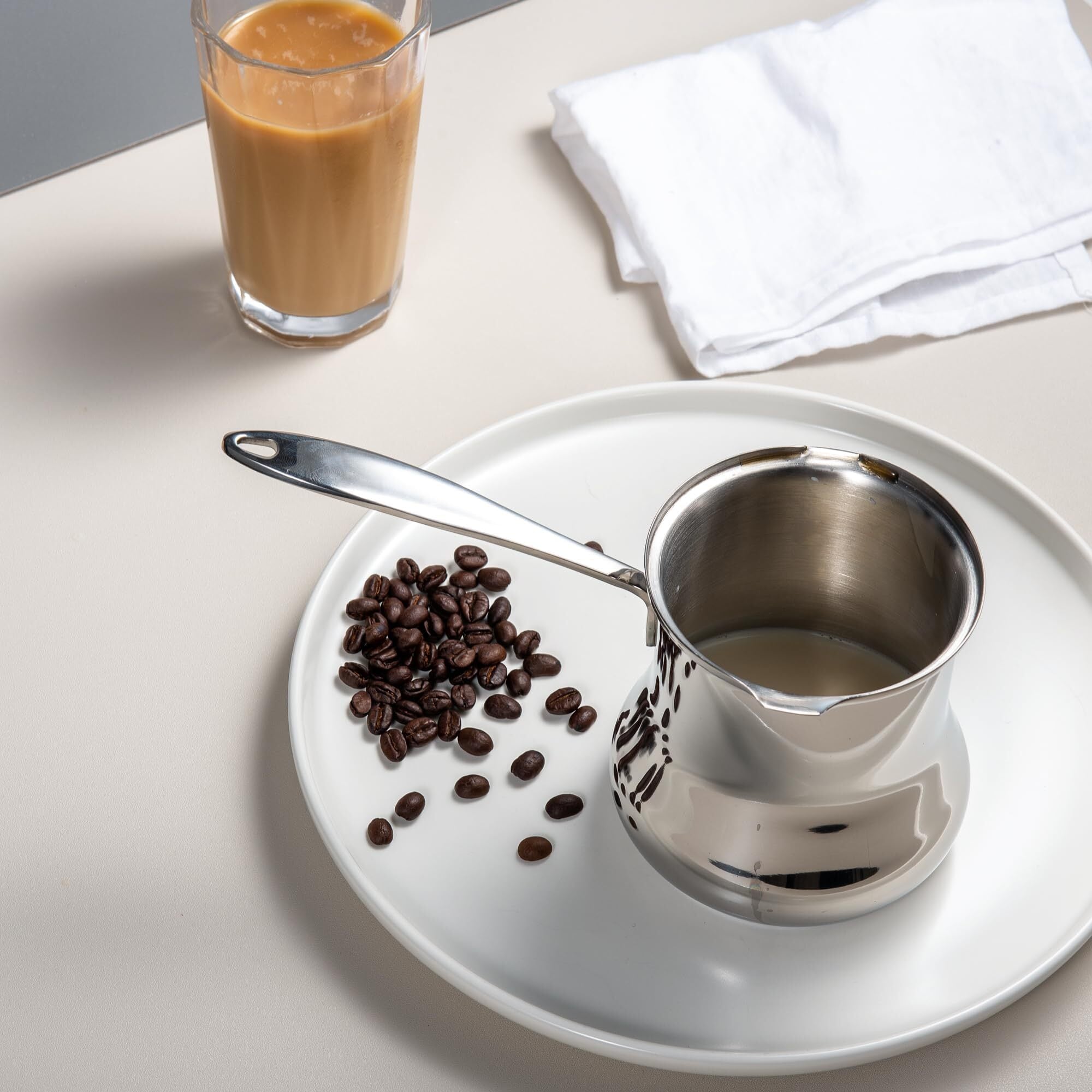手作業による研磨加工をほどこしたステンレス、日常的なキズ、腐食に耐えられる設計。家庭、レストラン、ホテルなどにも適応のミルクパンです。